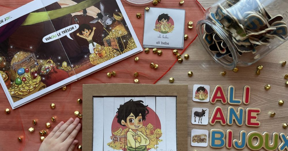 Lundi. Nous voici de retour avec Ali baba que nous avons mis de côté pour une semaine. J’ai fait un support en carton pour faciliter les puces quand elles font leur puzzle. Et honnêtement ça leur a bcp plus car ça ne glisse plus. Du coup je ferai toujours les puzzles de la même taille pour le réutiliser.