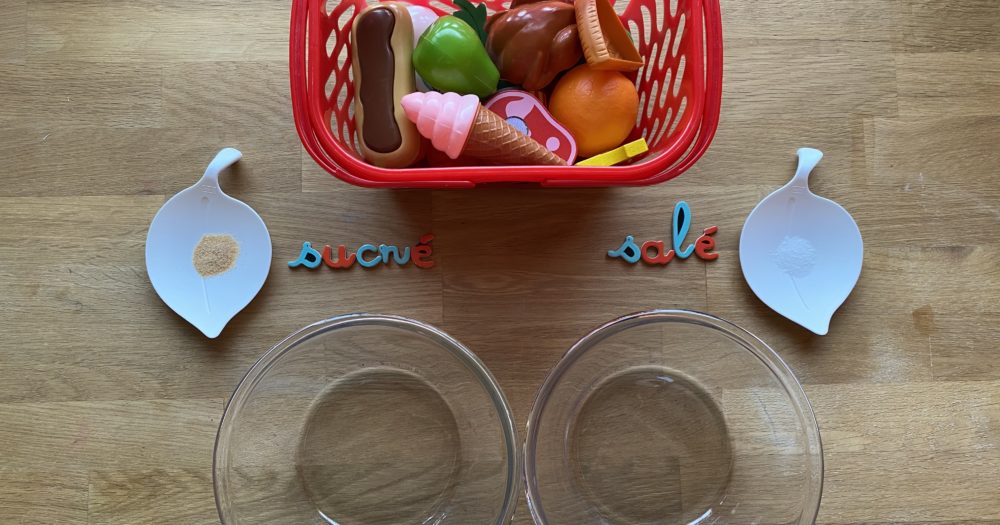 Cet atelier qui me paraissait pourtant simple ne l’a pas été. Dans un premier temps j’ai fait goûter à ma grande du sucre en poudre puis du sel pour bien distinguer les deux . Puis elle a effectué un tri avec sa dînette.