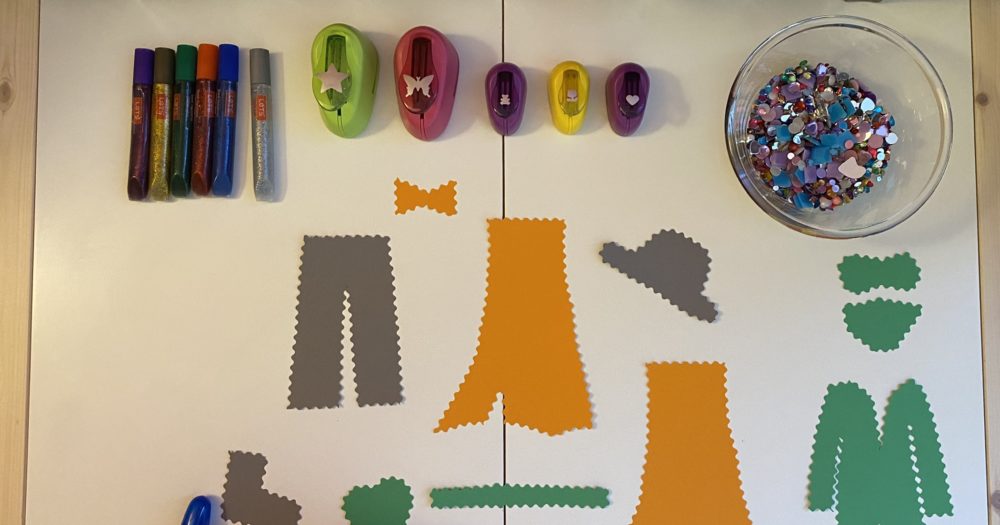 Le but est simple, il faut customiser les vêtements au préalable découper avec des stras, des paillettes, des boutons etc… J’ai découpé moi même car c’était avec des ciseaux crantés assez durs, mais il est possible de laisser un enfant (selon l’âge) découper sans problème avec des ciseaux adaptés. Vous pouvez dessinez les formes des vêtements et le laissez couper, je le ferai la prochaine fois.