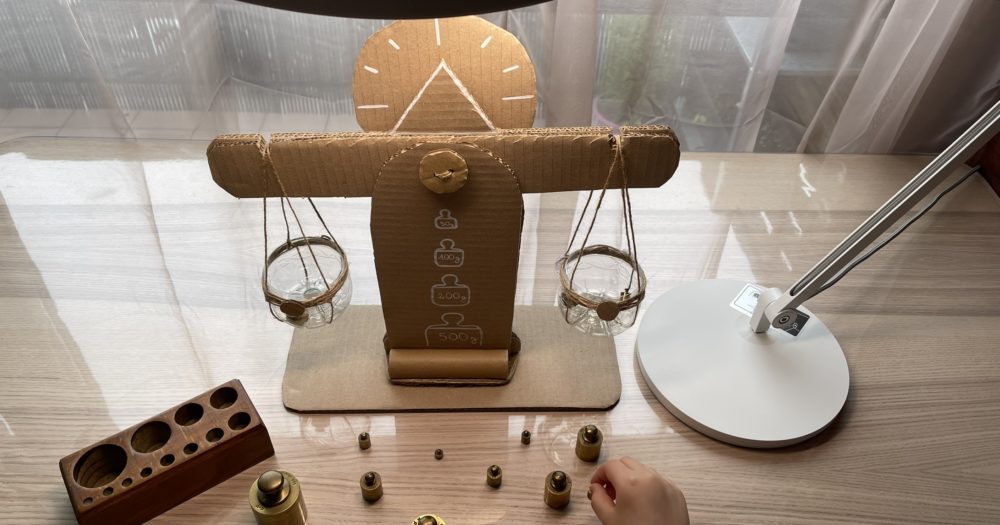 Vous pouvez voir sur cette photo Shérine qui utilise des poids que j’ai récupérés chez ma grand-mère pour utiliser la balance. Une balance en carton qui fonctionne bien entendu et mes deux puces étaient conquises. J’aime leur montrer qu’avec pas mal d’imagination on peut faire des choses sympa à moindre coût.
