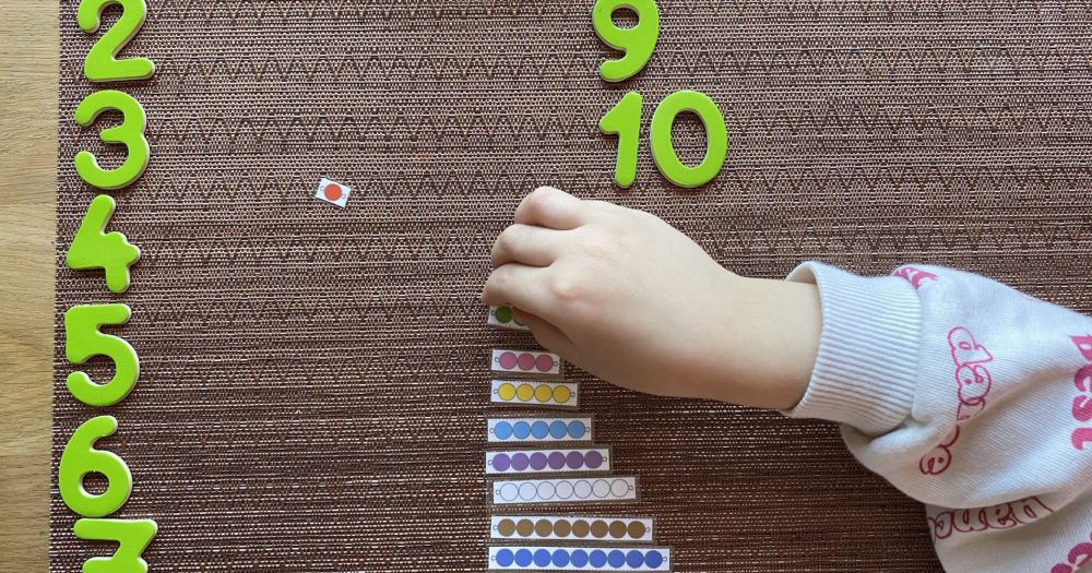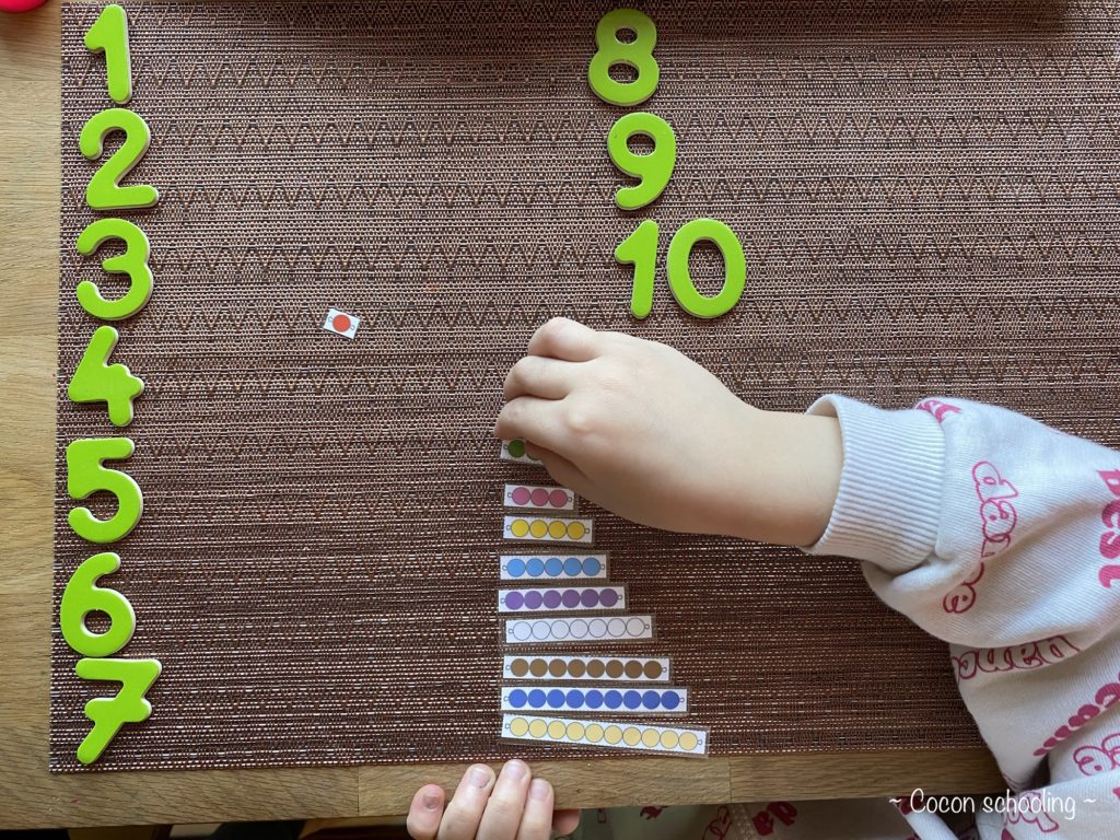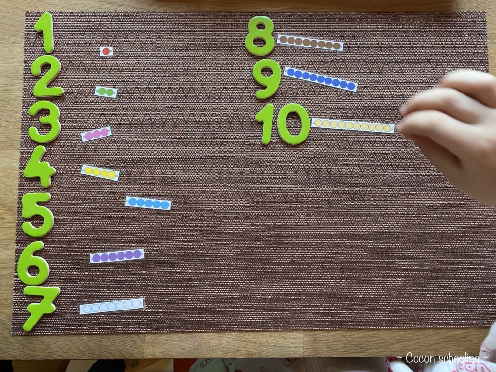 J’ai découpé dans un cahier d’activité Montessori les perles de 1 à 10, elle permet d’associer les écritures chiffrées à des quantités.