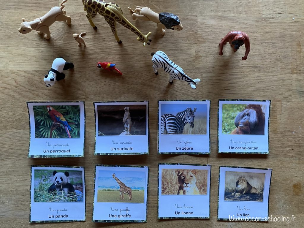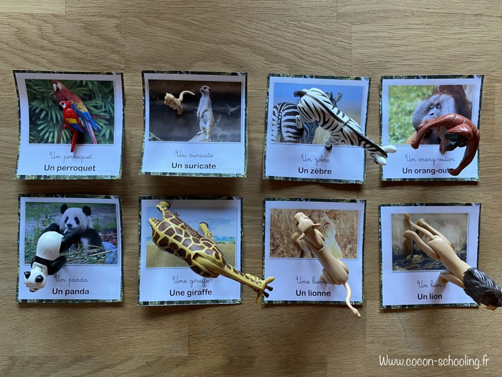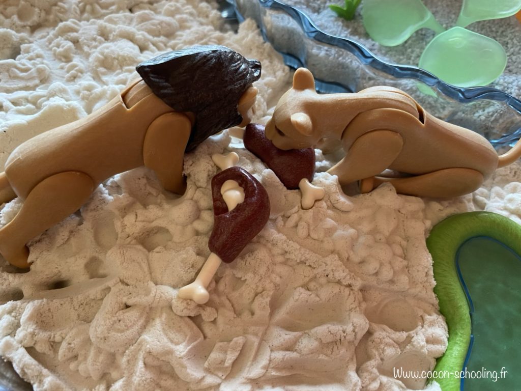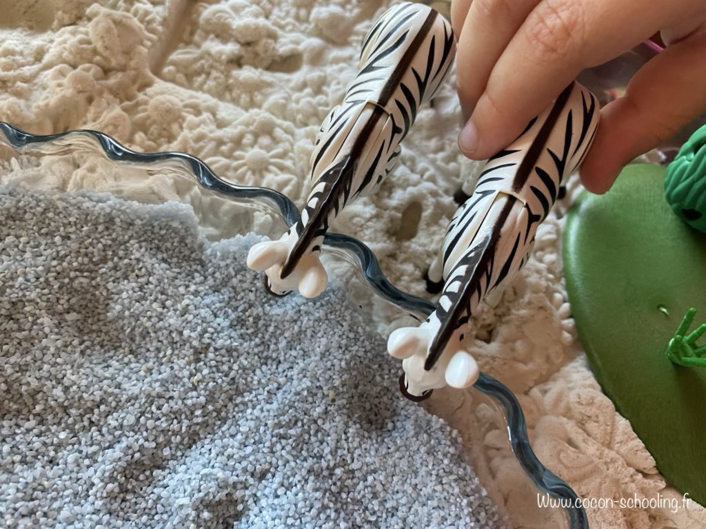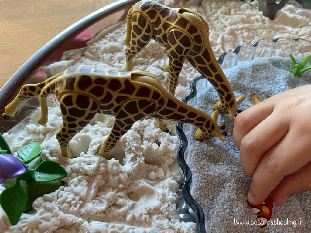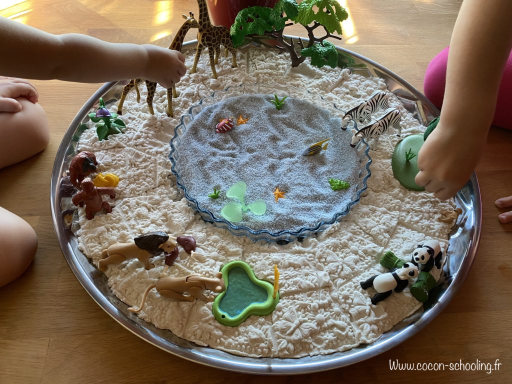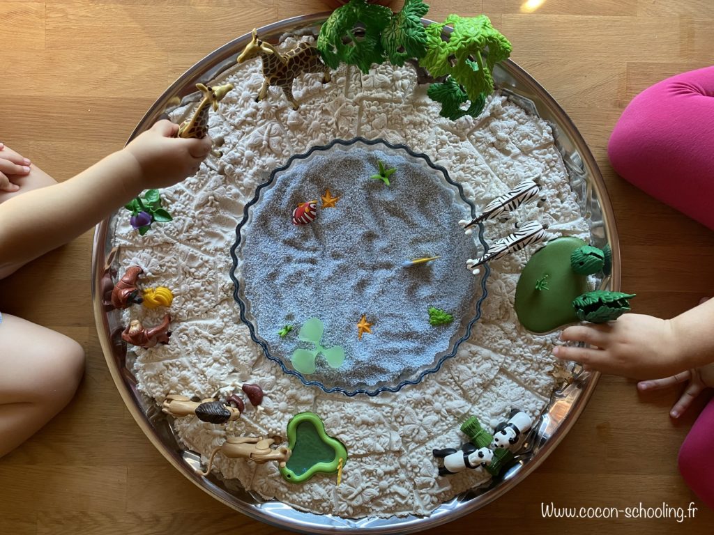 Voici un bac sensoriel, un mini monde et une invitation à jouer sur le thème de la savane et de la jungle. J’ai proposé à mes puces cet atelier pour qu’elles jouent ensemble et s’apaisent un peu, car avec la chaleur les esprits s’échauffent et les disputes éclatent. Ça a bien marché, je suis contente.