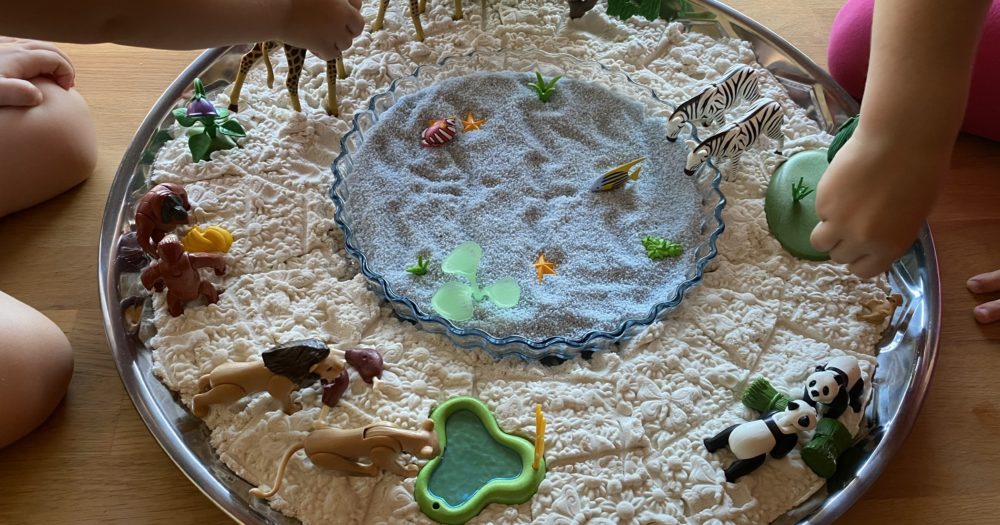 Voici un bac sensoriel, un mini monde et une invitation à jouer sur le thème de la savane et de la jungle. J’ai proposé à mes puces cet atelier pour qu’elles jouent ensemble et s’apaisent un peu, car avec la chaleur les esprits s’échauffent et les disputes éclatent. Ça a bien marché, je suis contente.