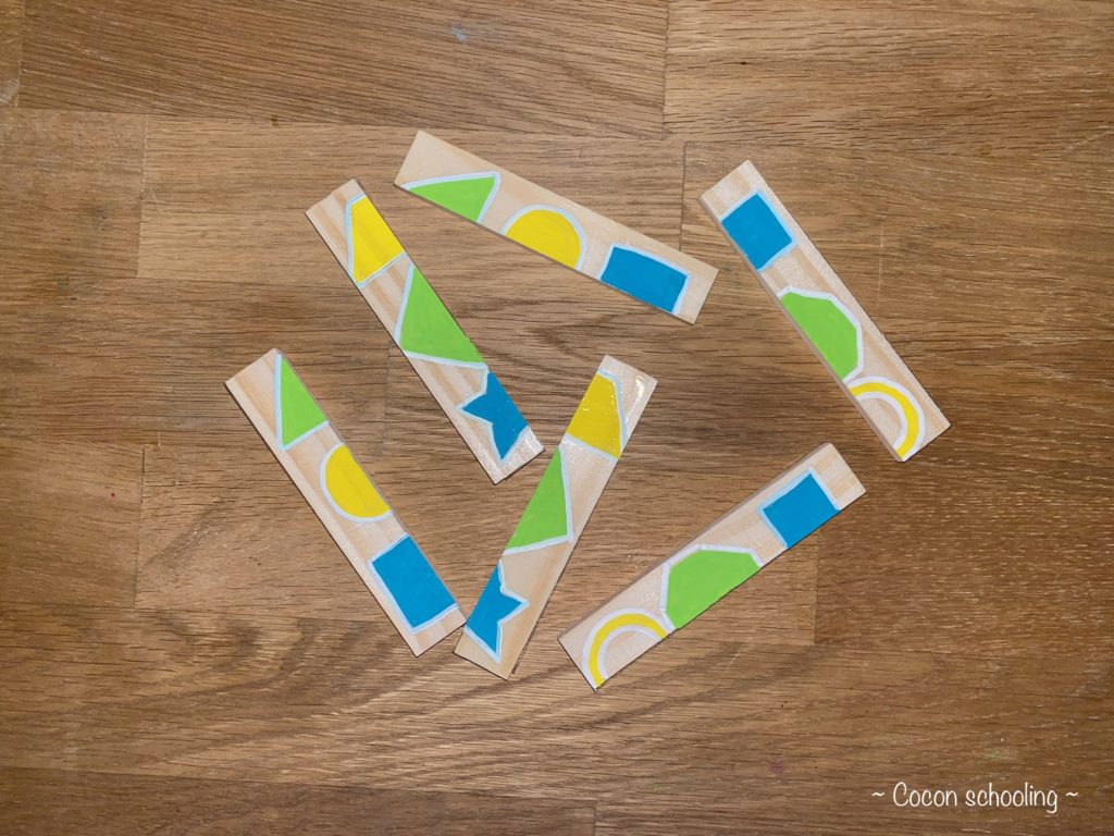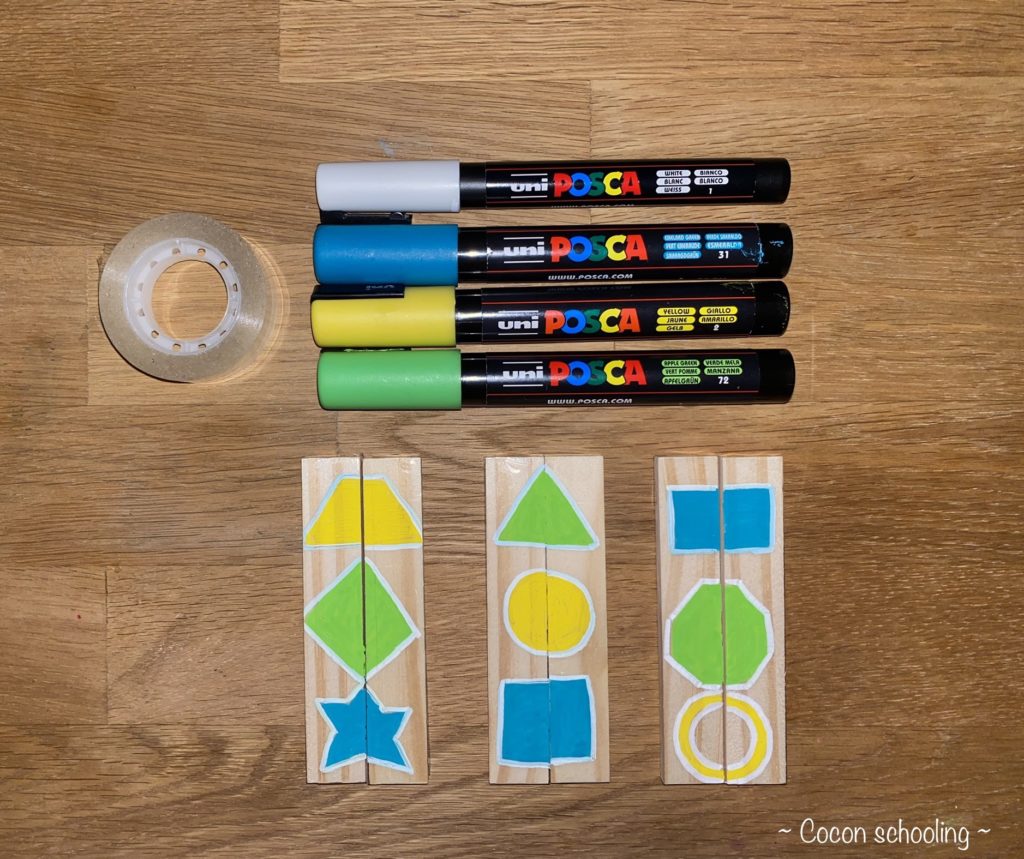 Voici une autre activité avec les kaplas, toujours dans l’idée d’une activité éphémère et de ne pas abimé le matériel, j’ai mis du scotch sur tout le kapla, ce qui le rend impeccable une fois enlevé. J’ai dessiné avec des poscas, car ça tient sur le scotch et sèche très rapidement.
