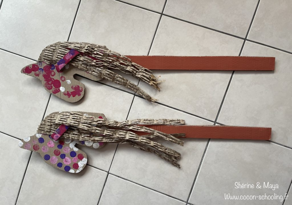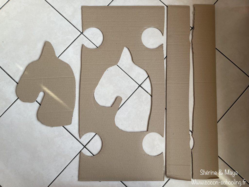 Zoom sur le cheval, aujourd’hui j’ai proposé à mes puces de faire des balais cheval, ainsi que du décopatch. Pour cela j’ai découpé dans du carton une tête de cheval, deux grandes bandes pour que ce soit résistant, ainsi que des poignées et pour la crinière j’ai mis du carton découpé que j’avais eu dans un colis.