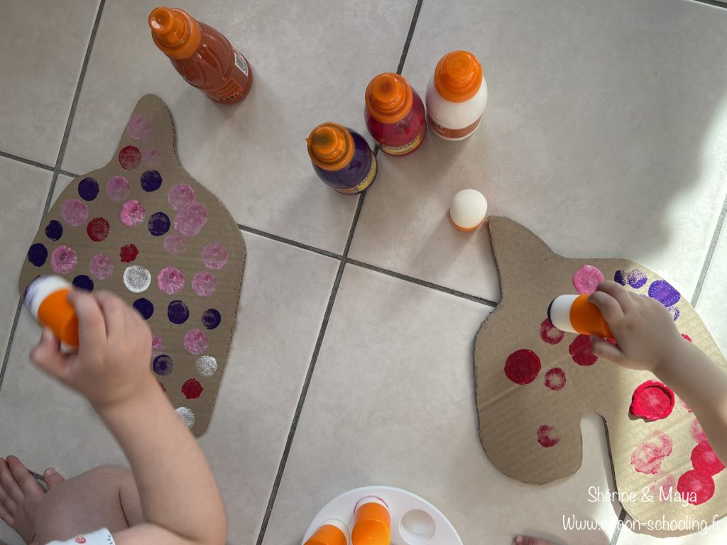J’ai tout collé avec un pistolet à colle, les filles ont fait la peinture avec des pinceaux pochoirs vraiment très pratique (je vous ai d’ailleurs mis le lien plus bas).