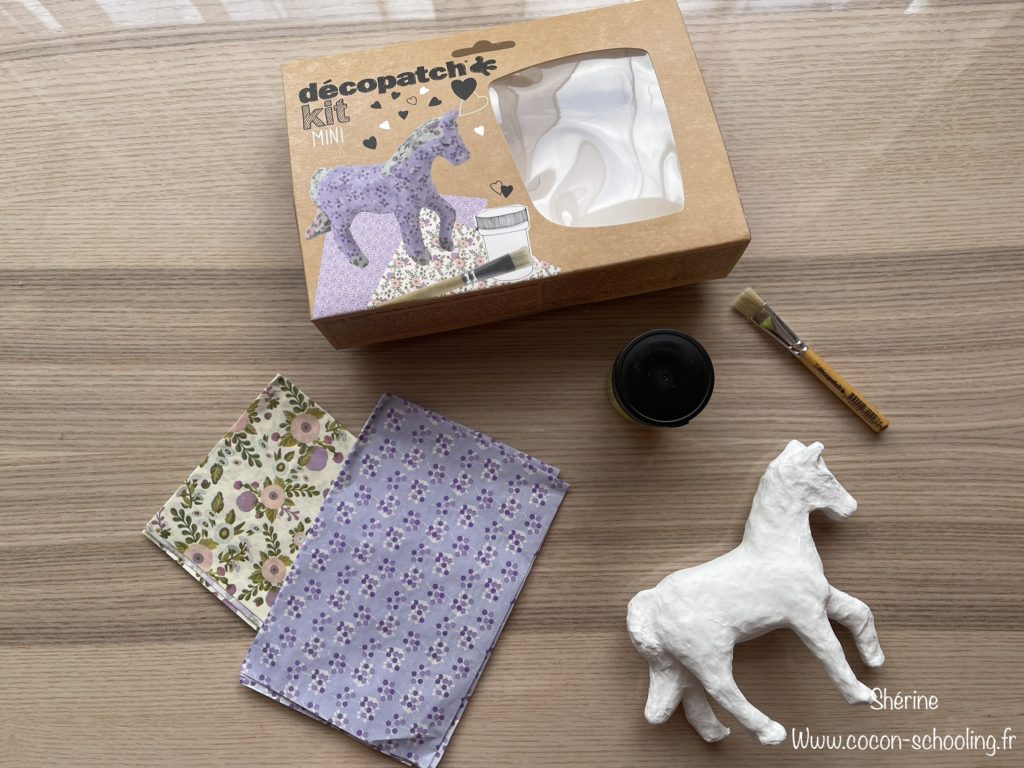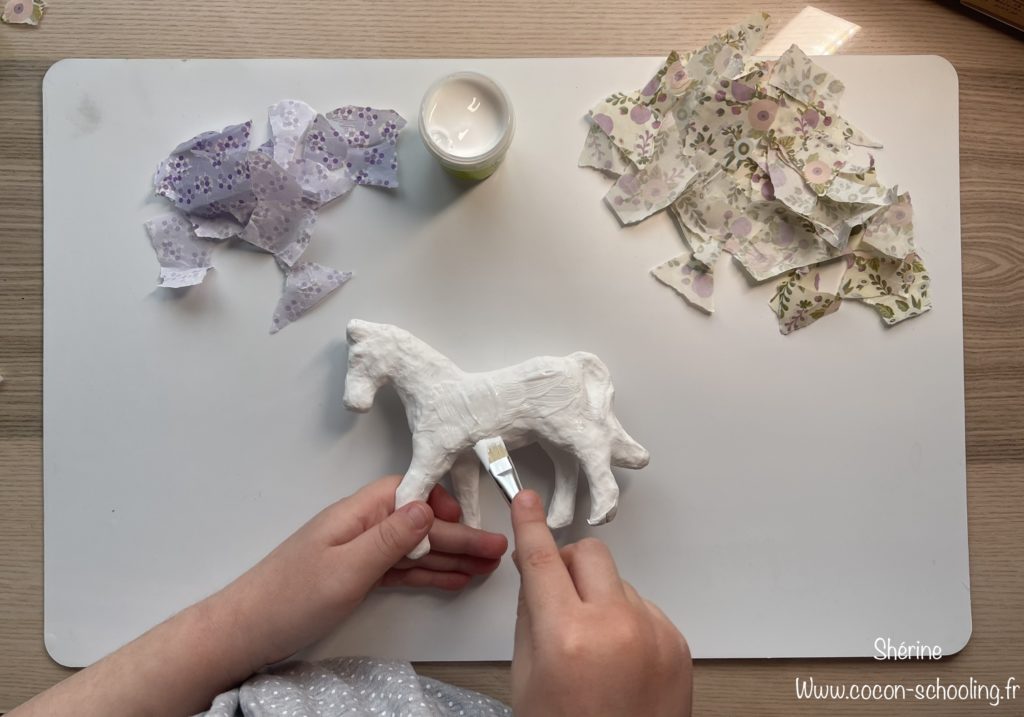 Voici le cheval en Décopatch que Shérine a fait, elle aime beaucoup mais n’a pas la patience de le faire d’une traite. Du coup elle le fait en plusieurs fois, Maya l’a aidé à découper les feuilles, ça tombe bien car ça lui a fait travailler les petits doigts.