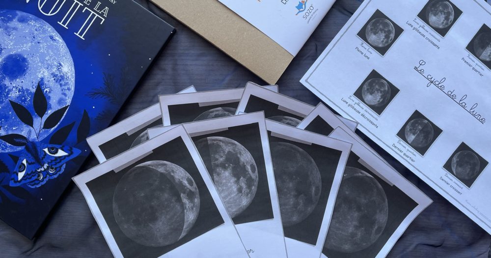 Un livre d’une beauté incroyable chez Seuil Jeunesse La marinière , un vrai documentaire qui illustre la nuit avec des textes vraiment très passionnants. J’ai mis en avant un sujet qui passionne Shérine : la lune. Retrouvez les cartes en téléchargement plus bas.