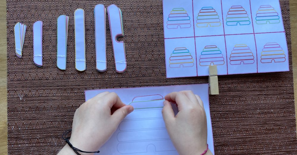 Ce jeu à pour but de travailler les couleurs ainsi que la taille de la ruche. On travaille comme avec les cartes à pince avec une pince à linge pour faire bosser les petits doigts. L’avantage est aussi que l’enfant positionne bien ses doigts comme pour la tenue du crayon lors de l’écriture.