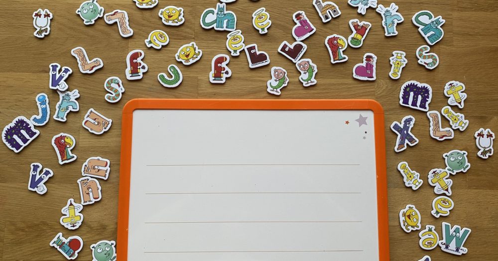 Ici j’ai mis un pot de consonnes et un de voyelles, je lui ai demandé de tirer une lettre de chaque pour faire une syllabe qu’elle doit ensuite lire.