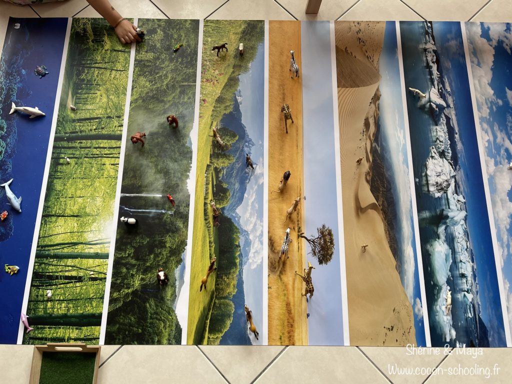 Les filles ont disposé leurs animaux playmobil dans leur lieu de vie, c’était super intéressant. On a ensuite sorti les cartes de nomenclature pour le faire avec. Nous n’avons pas tous les animaux, mais cela viendra je l’espère, car c’est vraiment top.