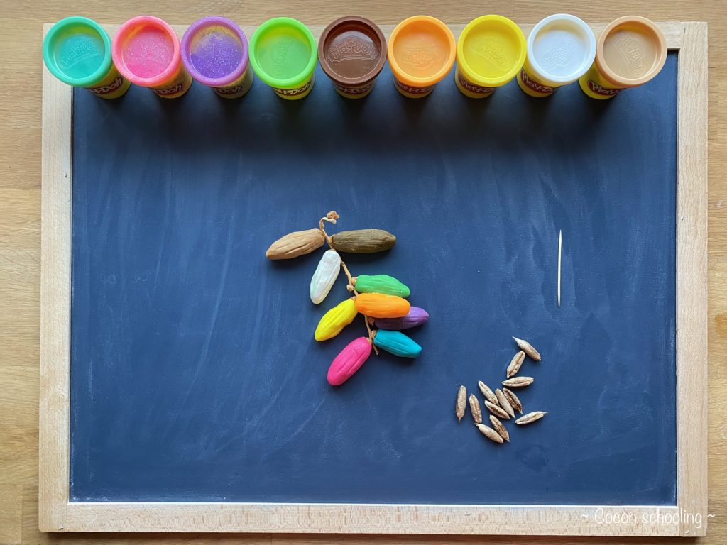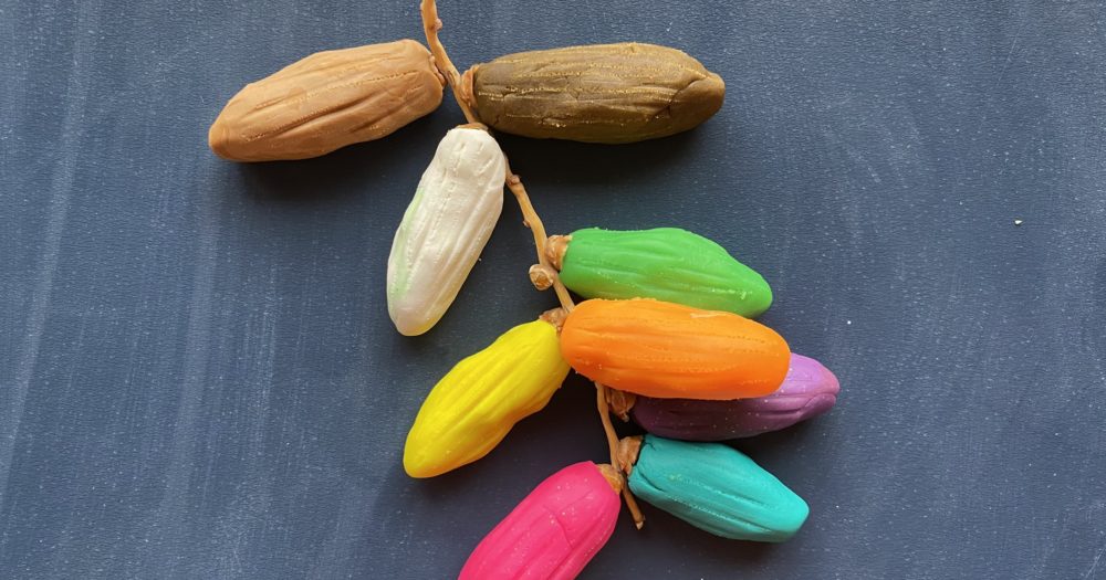 J’ai fait des boules de pâte à modeler dans les quelles j’ai mis un noyau de datte, puis je les ai formées et tracé pour qu’elles ressemblent le plus possible à de vraies dattes.