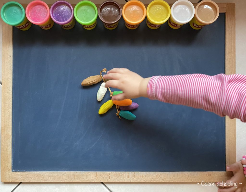 Je les ai ensuite posées sur la branche comme si elles sortaient de la boîte! Mes filles se sont amusées à les décrocher et libérer le noyaux.