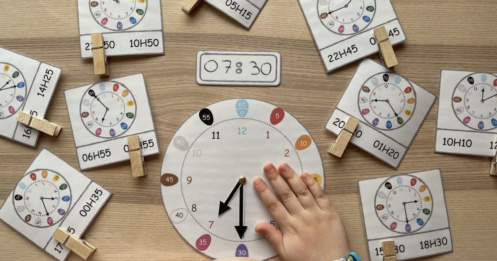 On essaie de reprendre l’apprentissage de l’heure cette semaine, en espérant trouver plus de motivation de la part de Shérine. Au delà des ateliers ludiques que je lui propose, si à côté de ça elle ne pratique pas, elle oublie vite.