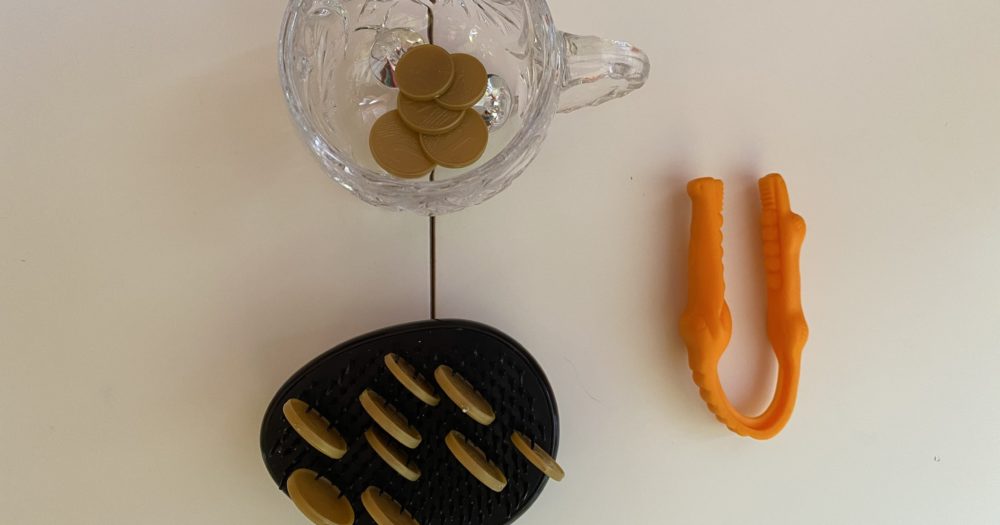J’ai mis des fausses pièces de monnaie dans une brosse à cheveux, puis j’ai demandé à mes filles chacune leur tour de les enlever. Attention à l’âge de l’enfant, il faut bien rester à côté, comme chaque atelier qui comporte des petits objets.
