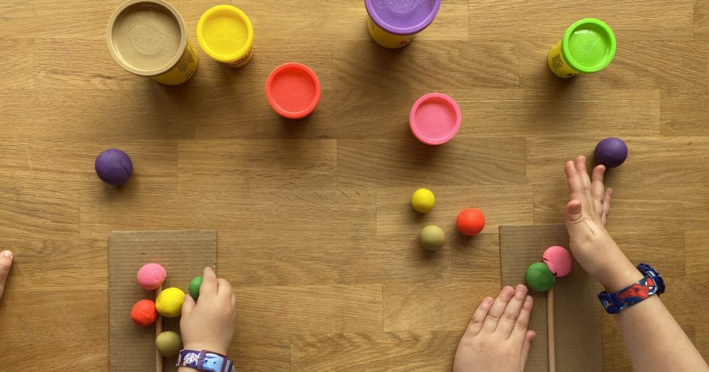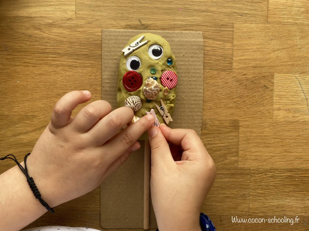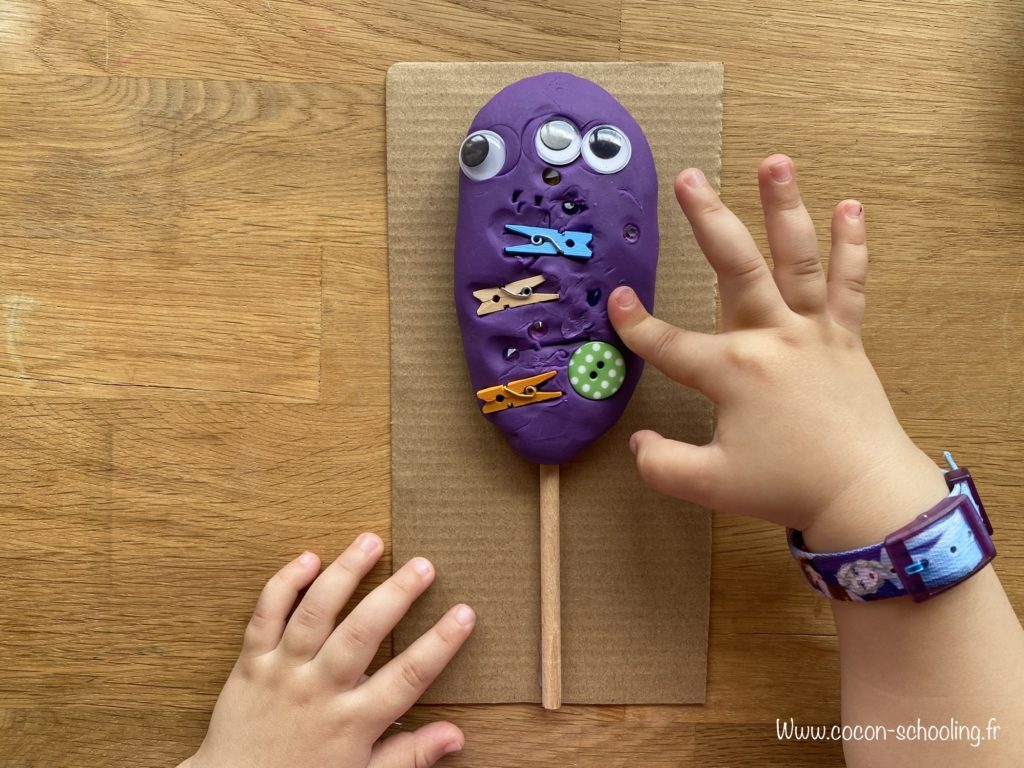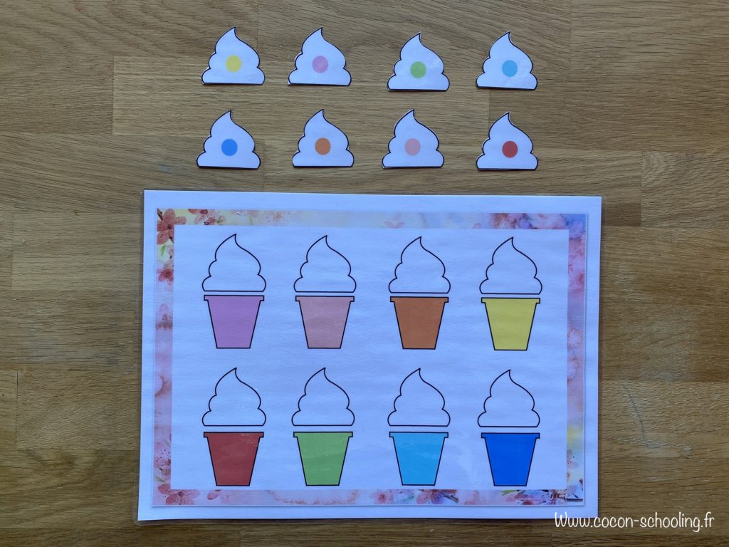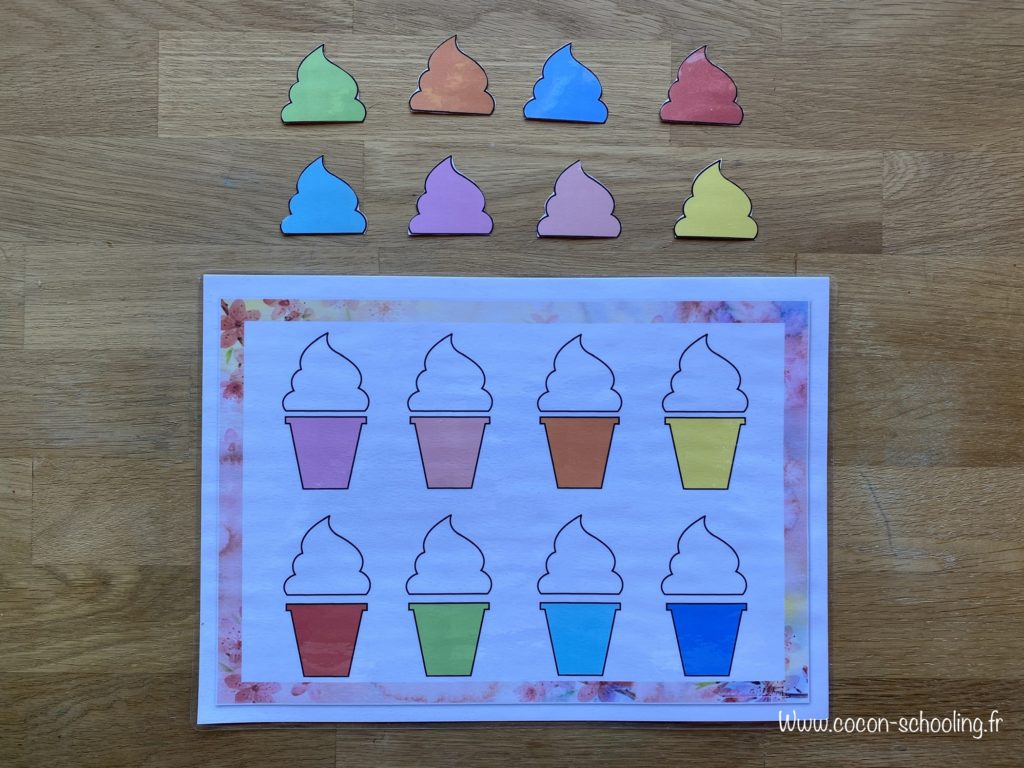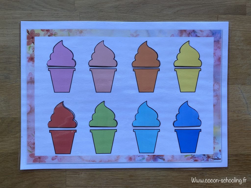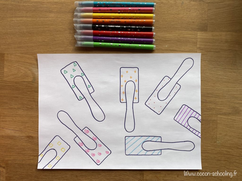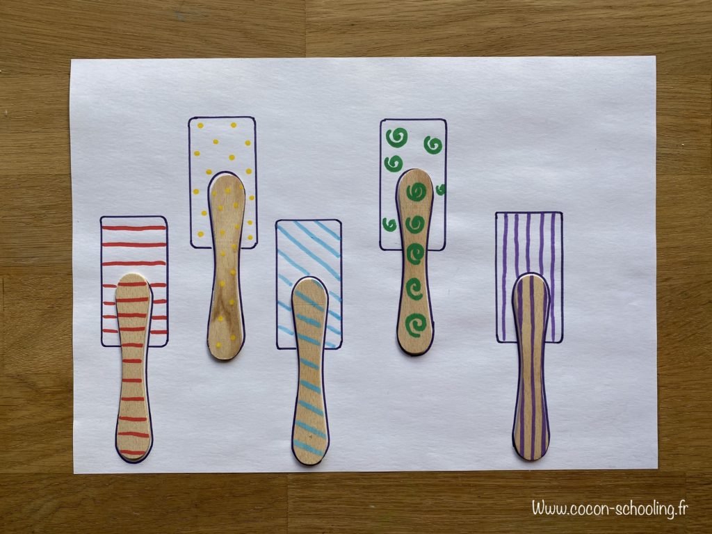 Pour ma grande je lui ai proposé de reproduire les graphismes qui sont sur les glaces, sur les bâtons, et pour la petite replacer au bon endroit les bâtons.