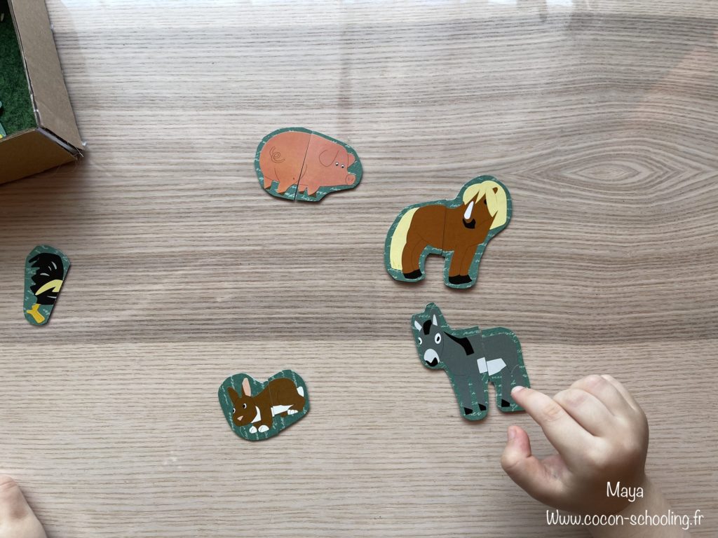 Pour Maya j’ai collé les gommettes sur un papier cartonné, puis je les ai coupés en deux pour qu’elle puisse reconstituer les animaux. Elle a tout de suite aimé et s’est prise au jeu pendant un long moment