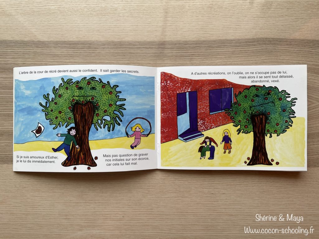 le marronnier de la cour de récré des éditions Ebla, une douce histoire d’un petit garçon qui nous parle d’un arbre dans sa cour de récré. On part vraiment dans l’histoire car on a la plupart d’entre nous eu un arbre dans notre école primaire autour duquel on a courru, grimpé et joué dessus.