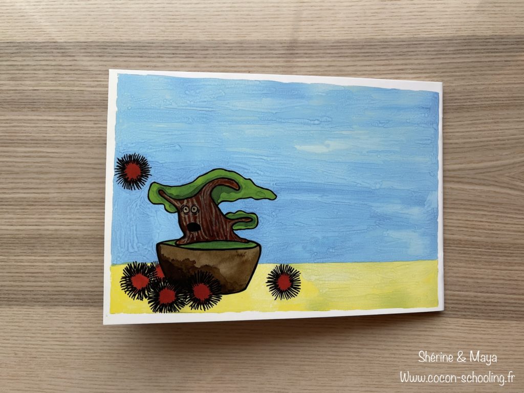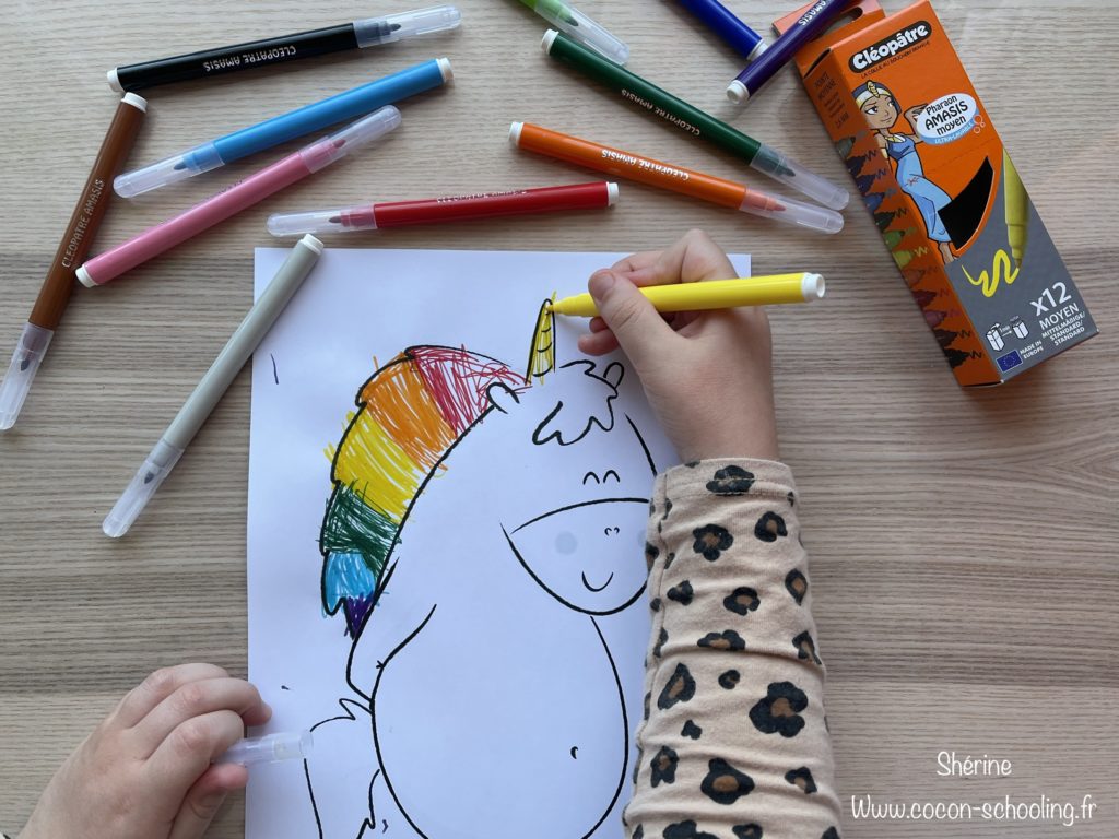 Voici Maya qui elle s’est amusée avec des brosses à forme, comme elle ne sait pas encore dessiner cela lui procure un sentiment de réussite. Le rendu est super sympa. Vous pouvez trouver les brosses chez 10Doigts juste ici: https://bit.ly/39C1QBK