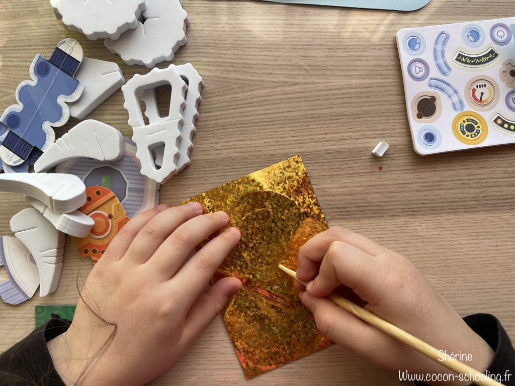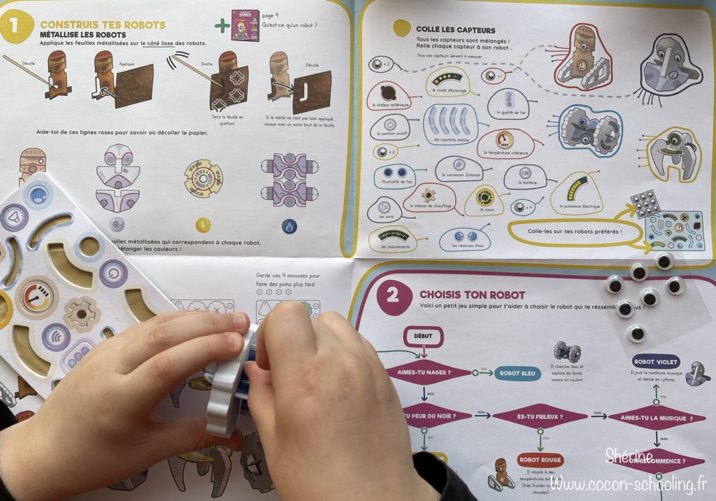 On a commencé par tout déballer, il y a un magazine qui accompagne les activités, il est bien construit, rempli de conseils, avec des histoires etc vraiment très sympa. Puis Shérine a commencé la construction des robots: 1. Défaire toutes les petites pièces, 2. Assembler les différents éléments, 3. Customiser à l’aide d’autocollants et d’un papier métallisé (c’est cette étape que Maya a faite et çà l’a beaucoup amusée).