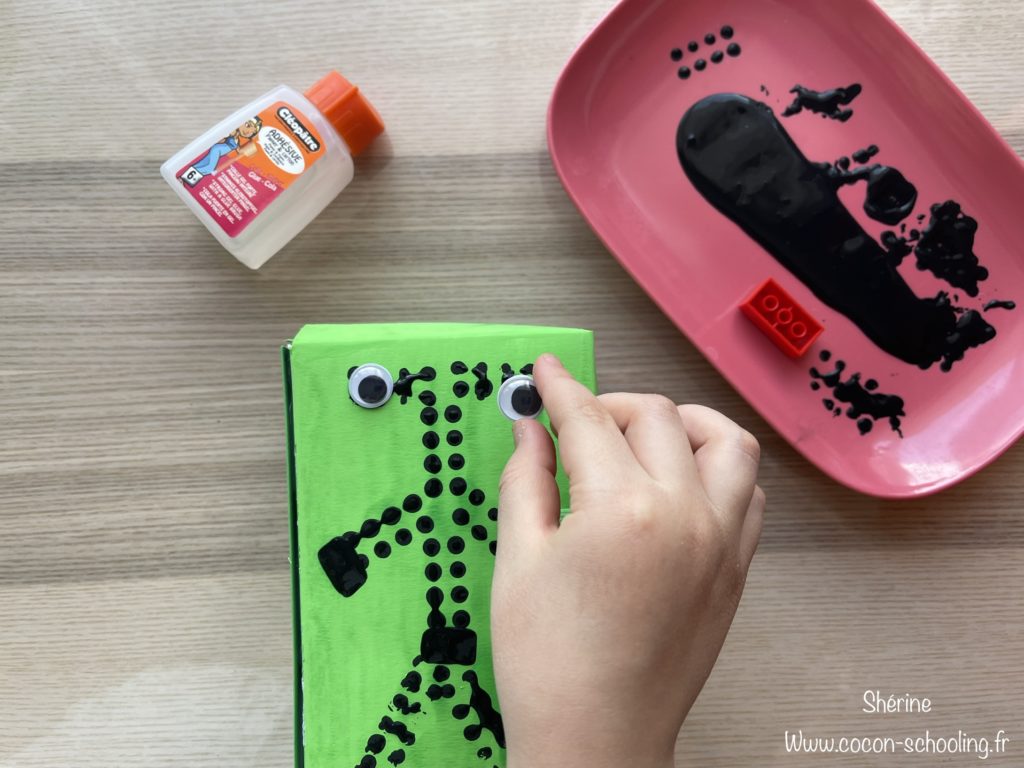 J’ai récupéré une boite de café Lidl, on l’a peinte, puis renforcer les cotés avec du papier cartonné, ensuite vient la déco. C’est un robot fait à l’aide d’un lego trempé dans de la peinture.