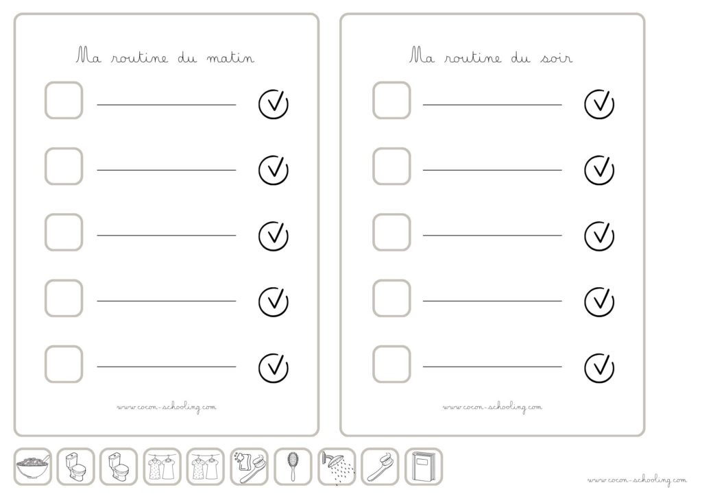 Hello, je vous partage la nouvelle routine des enfants que je vais mettre en place. Pour favorisé l’autonomie des trois, on verra ce que ça va donner. Je vous ai fait la même version que nous et une autre modulable. Bisous. Tatiana.
