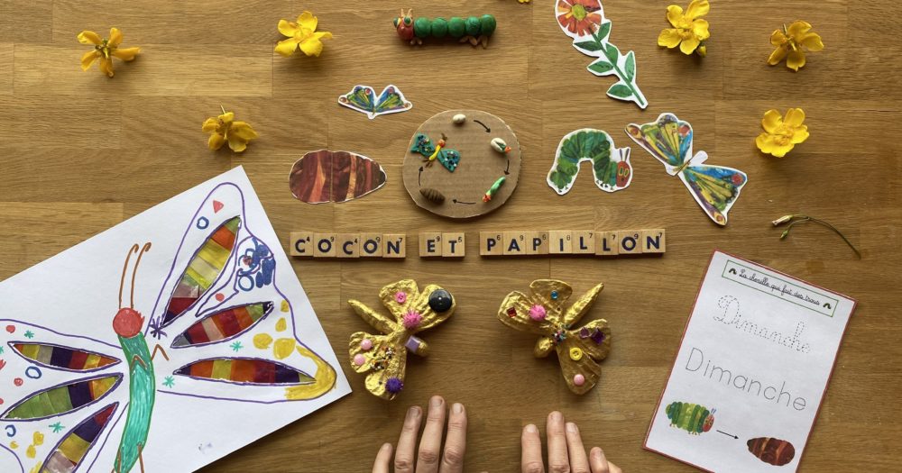 Ici elles ont réalisé une décoration sur des papillons achetés chez Truffaut, le plateau d’activité, je l’ai acheté chez Hema, un vrai coup de coeur.