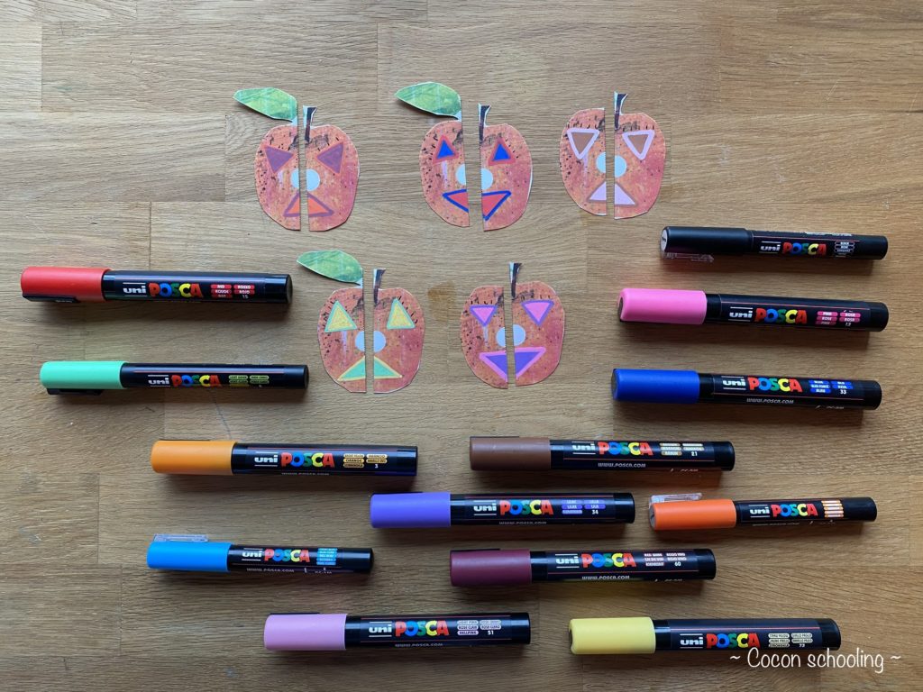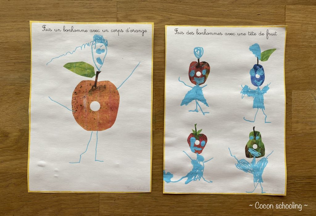 Concernant les dessins j’ai bien mis deux règles précises à respecter. Faire un bonhomme avec un corps d’orange et faire des bonhommes avec la tête de fruit.