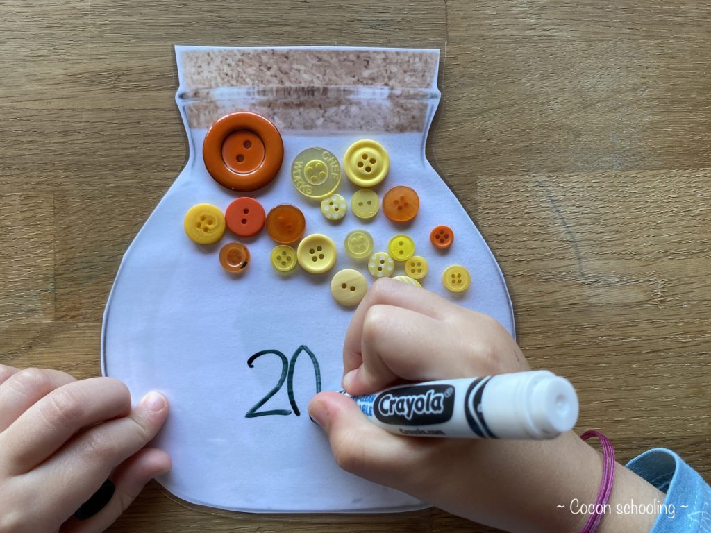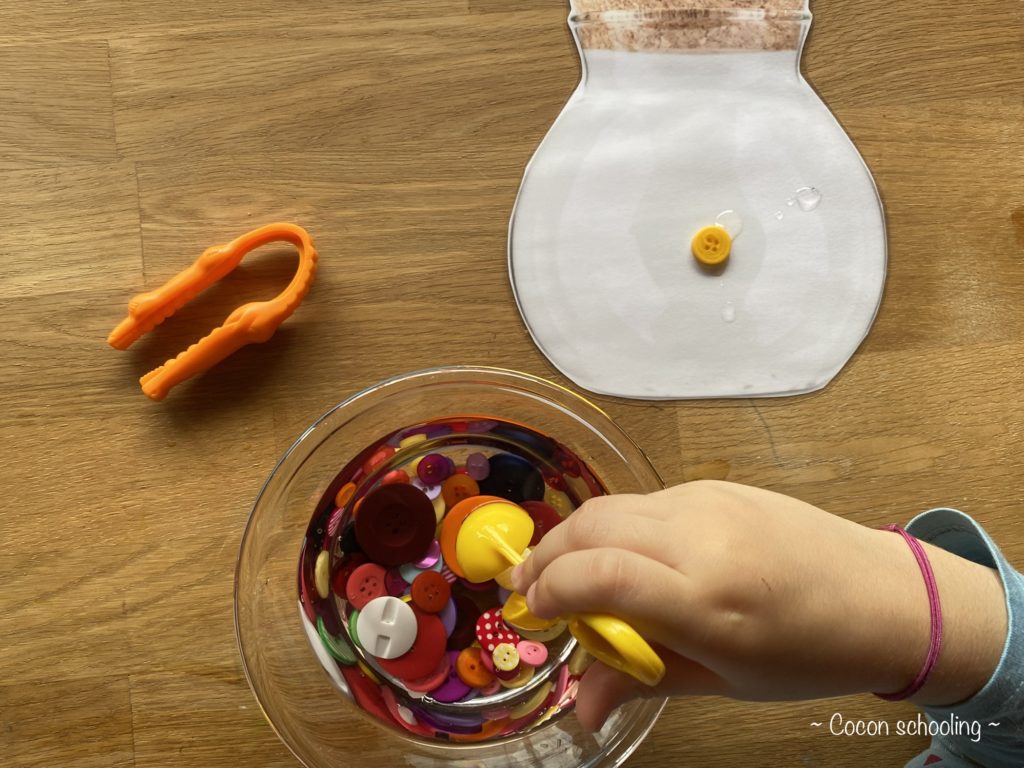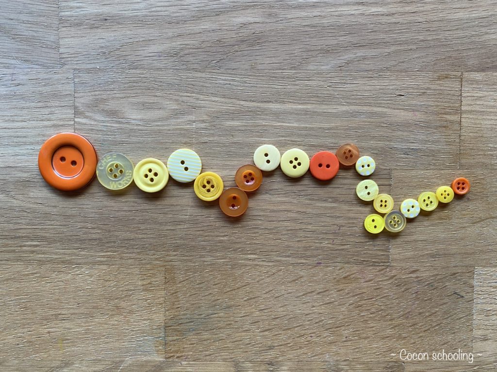 Ici les boutons représentent les émotions, donc ma grande a fait le nettoyage et a attrapé ce qui représente la joie. Puis nous sommes passés sur le tri par taille puis le dénombrement.