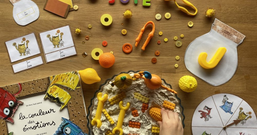 Nous entamons notre semaine des émotions accompagnées du livre magnifique ¨La couleur des émotions¨ avec la joie! Ce livre est vraiment trop beau, super bien fait et il plaît aux plus jeunes comme aux plus grands. Nous reprenons cette semaine les bacs sensoriels, ça faisait longtemps !!!