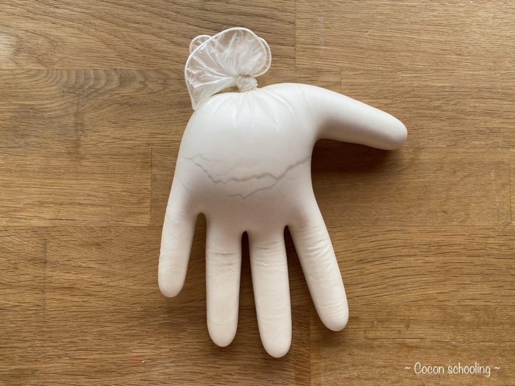 Je n’avais pas de ballon pour faire une balle anti stress donc nous avons fait ça avec un gant. Vous pouvez mettre du sable magique dedans c’est beaucoup mieux que la farine.