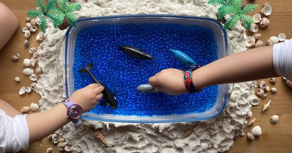 Bac sensoriel, c’est avec des balles d’eau, du sable magique et de petit coquillage que j’ai créé cet univers pour mes puces. Il faut ne vraiment pas penser que les bacs sensoriels sont compliqués à mettre en place, un rien peut leur plaire et les satisfaire.