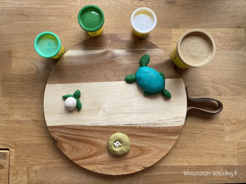 Voici notre bac sensoriel, sable bleu, et tortue qui a pondu ses petits oeufs sur la plage. Pour les oeufs j’ai utilisé des billes, le sable vient de chez Action et la figurine c’était il y à longtemps dans un magasin de destock qui ne les fait plus.