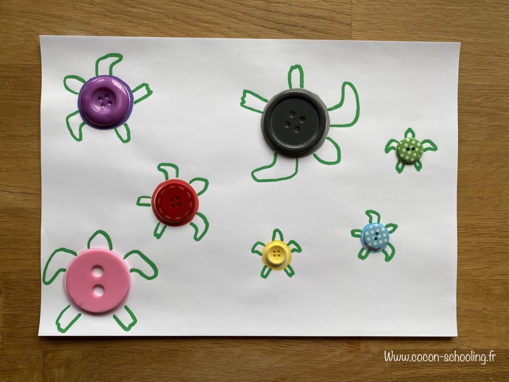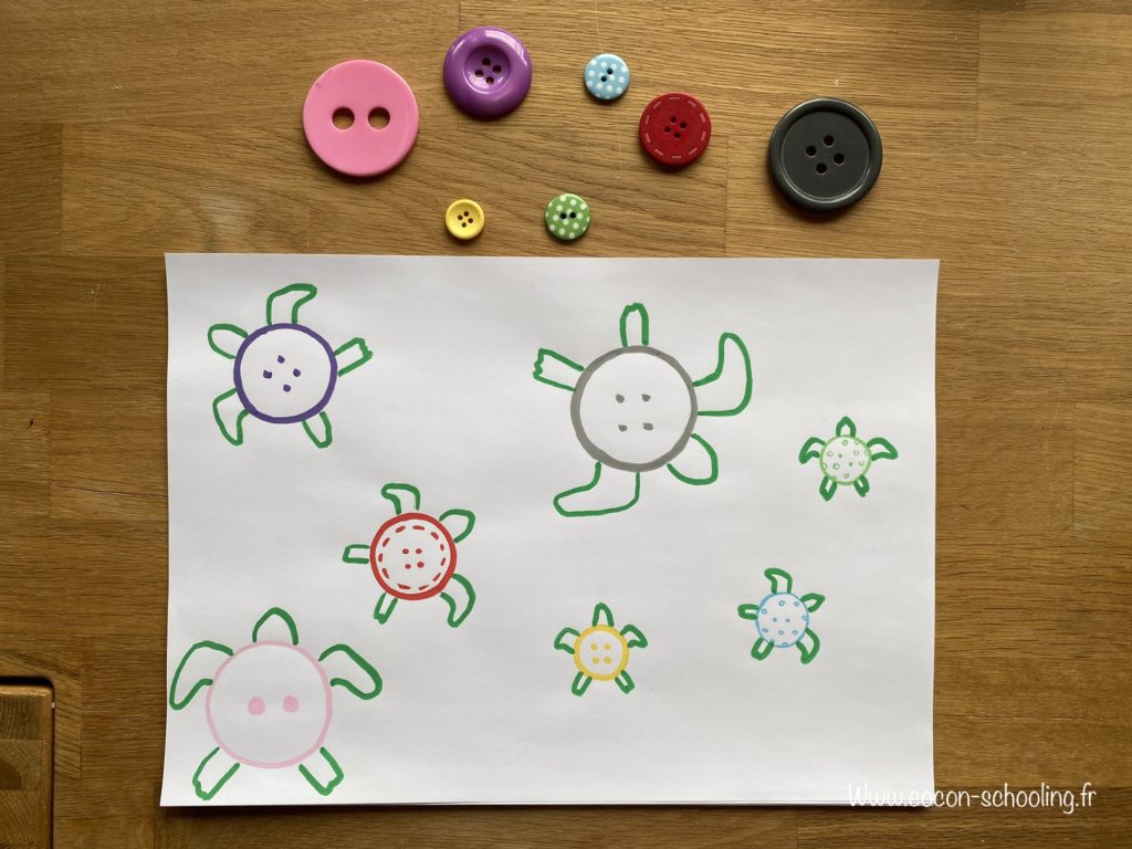 Atelier pour la petite puce, retrouver la place des boutons en fonction des couleurs et des formes.