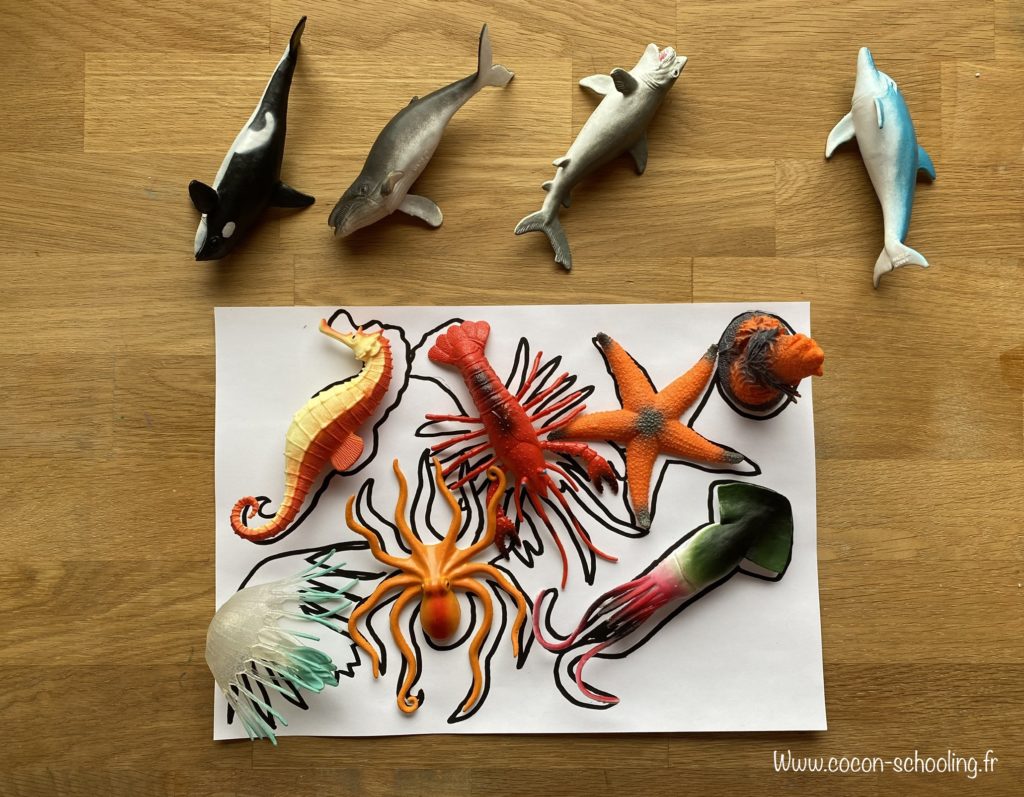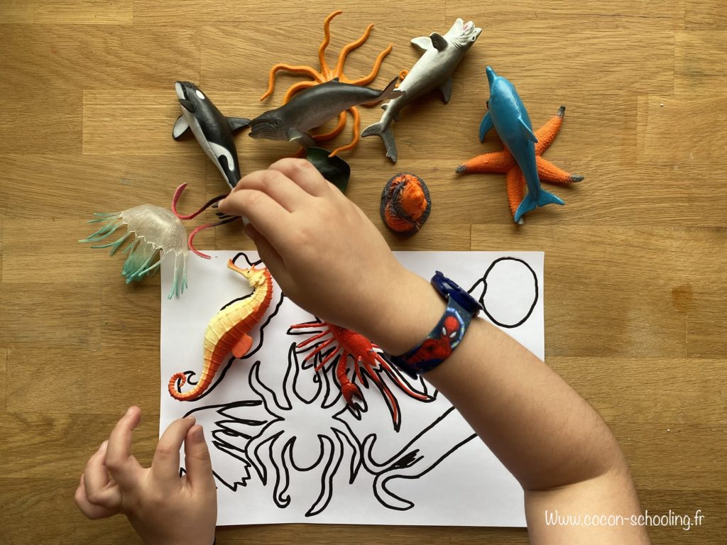 Il aurait été trop simple de mettre juste les formes choisies, j’ai donc mis toutes les figurines pour forcer ma grande à observé les détails.