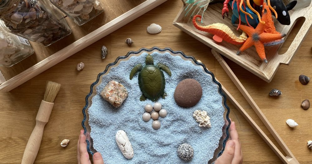 Voici notre bac sensoriel, sable bleu, et tortue qui a pondu ses petits oeufs sur la plage. Pour les oeufs j’ai utilisé des billes, le sable vient de chez Action et la figurine c’était il y à longtemps dans un magasin de destock qui ne les fait plus.