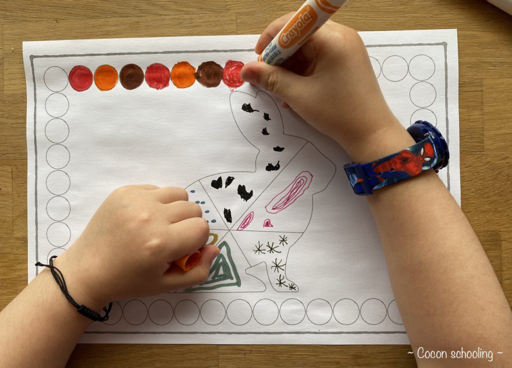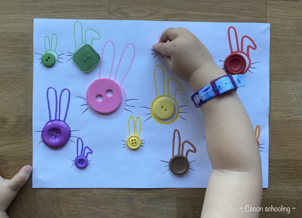 Le jeu des boutons, mes deux puces se sont amusées avec, l’idée était qu’elles retrouvent la place des boutons en fonction des formes et des couleurs. C’était plus pour ma petite mais ça a plu aussi à la grande.