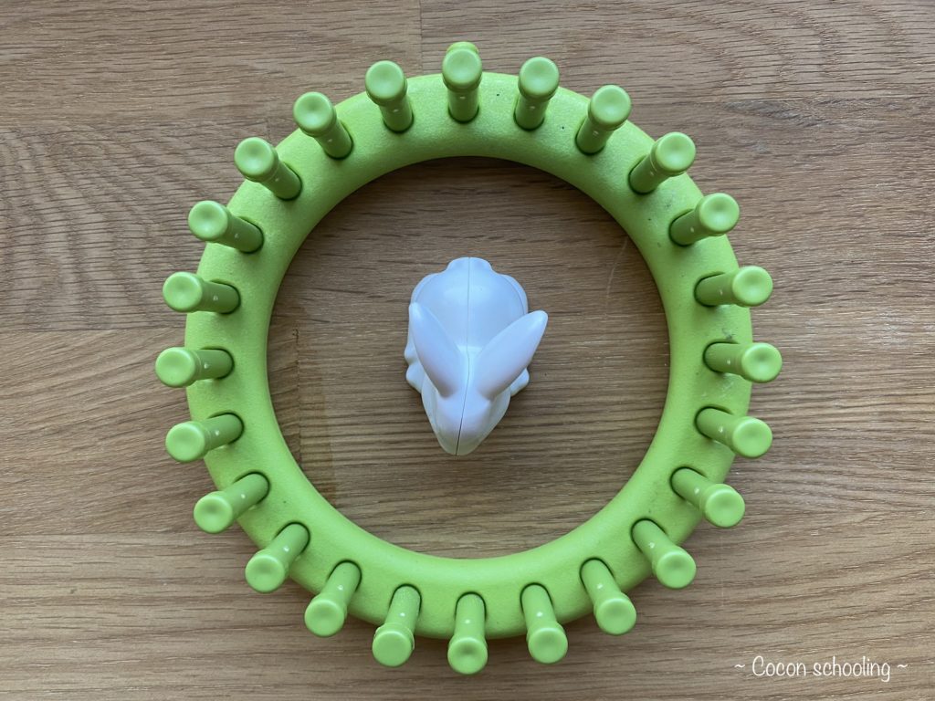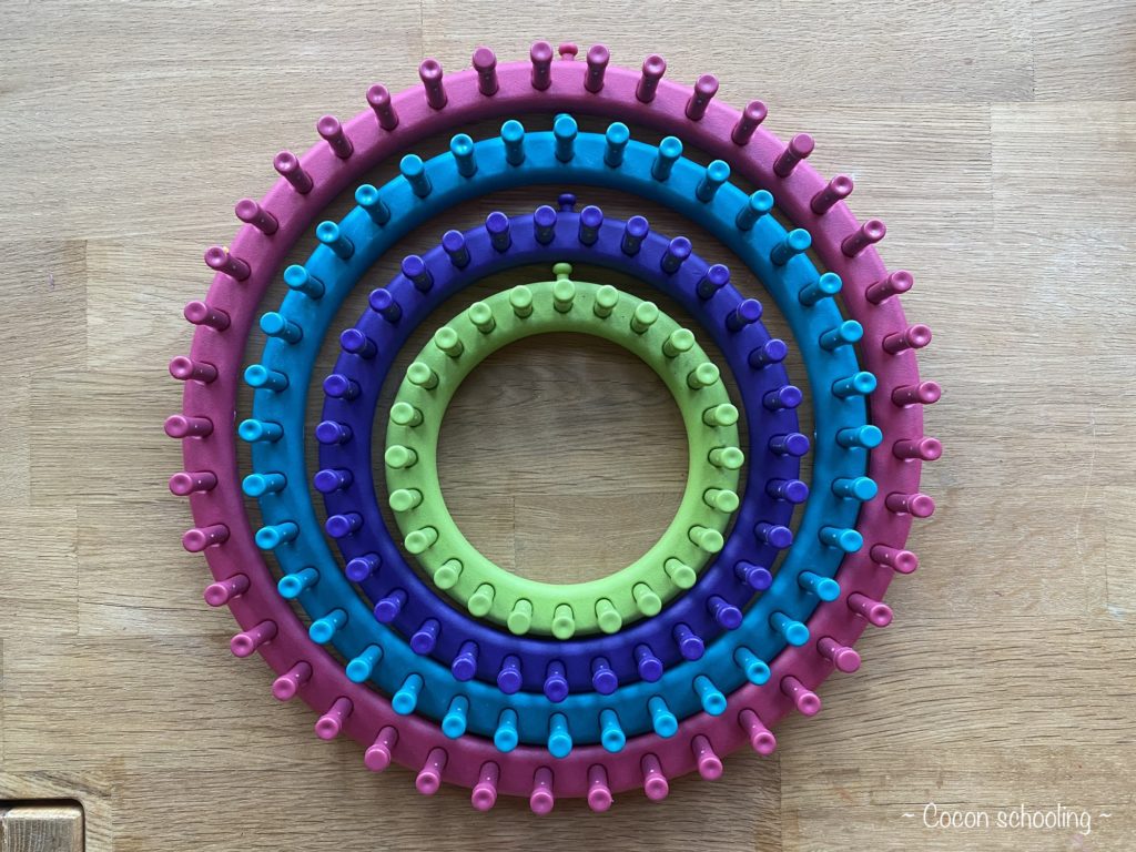 J’ai acheté ce lot qui est à la base pour faire des bonnets et des écharpes, mais nous l’avons utilisé sous plein d’autres formes. Les videos sont disponibles sur l’insta, enclos pour les animaux, jeux d’assemblage, motricité avec des élastiques.