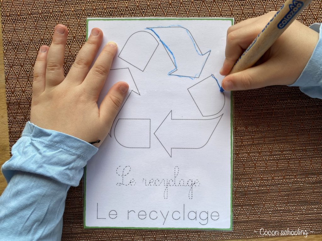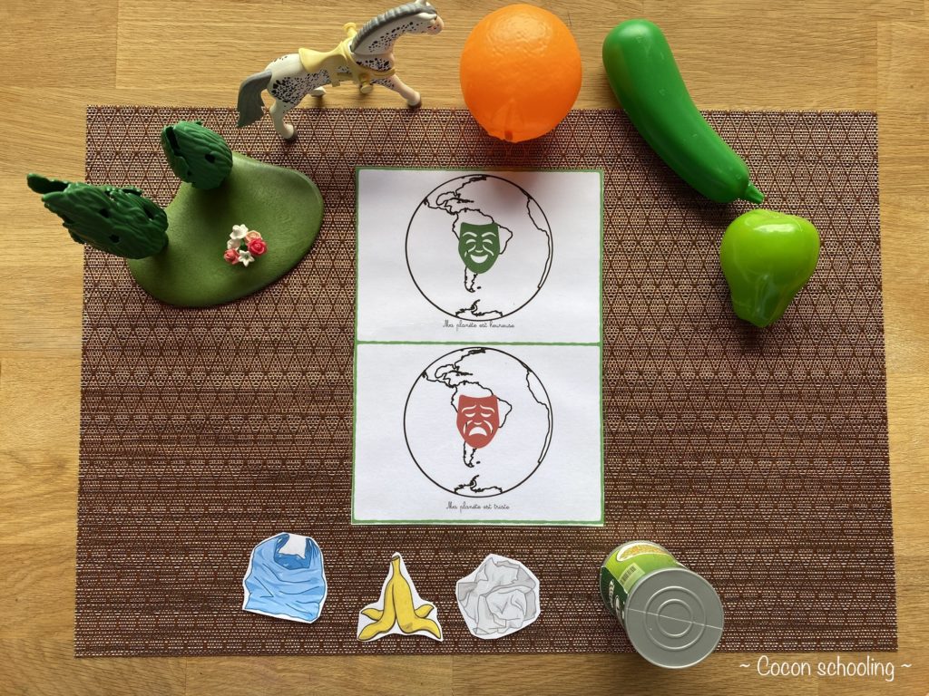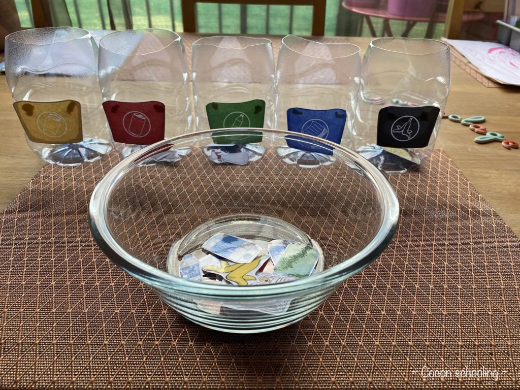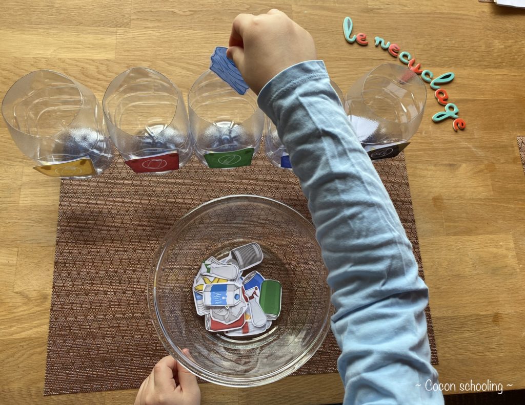 Pour réaliser l’activité j’ai coupé 5 bouteilles pour garder la partie basse pour faire des poubelles de tri. J’ai trouvé le pdf sur internet mais je n’ai pas la référence. J’ai mis dans un récipient ce que je voulais qu’elle jette et voilà.