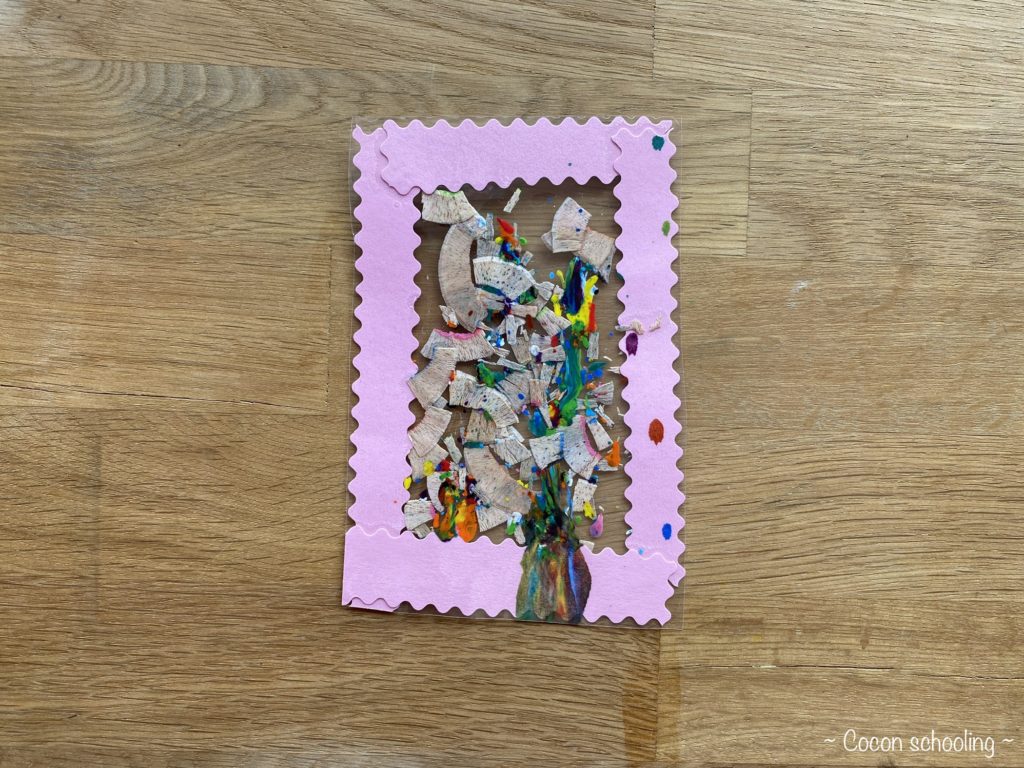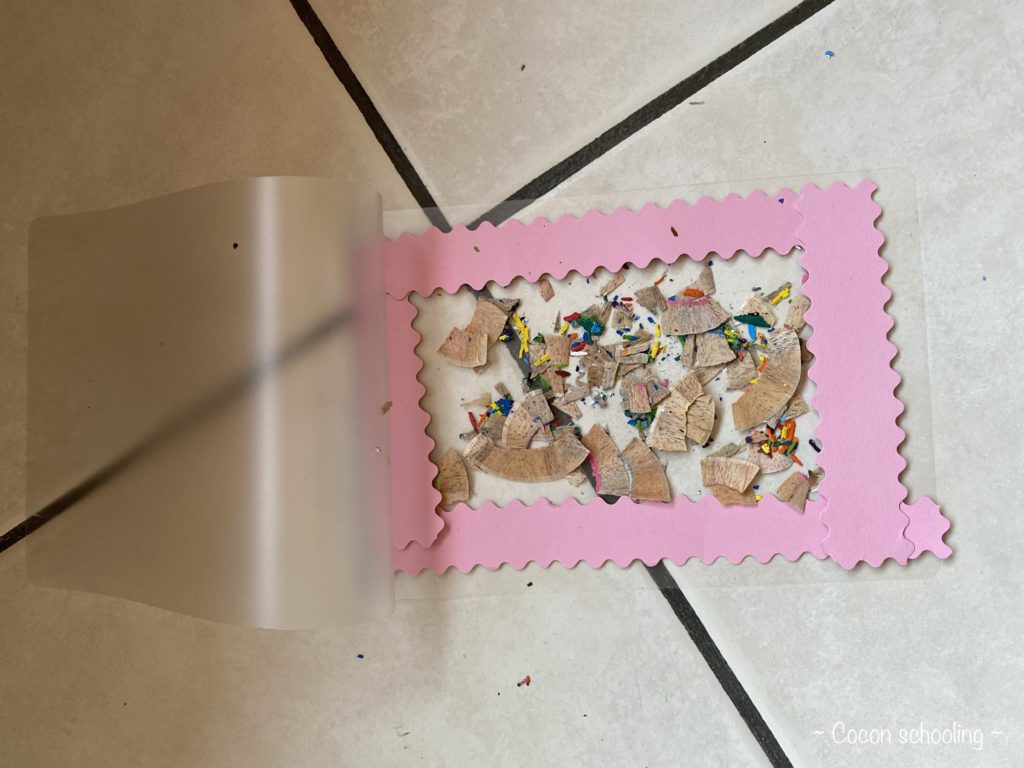 Dans une pochette à plastifier j’ai mis au préalable un cadre (4 bouts de feuille qui se chevauchent). Attention comme vous pouvez le voir sur la deuxième photo j’ai trop mis de mine.