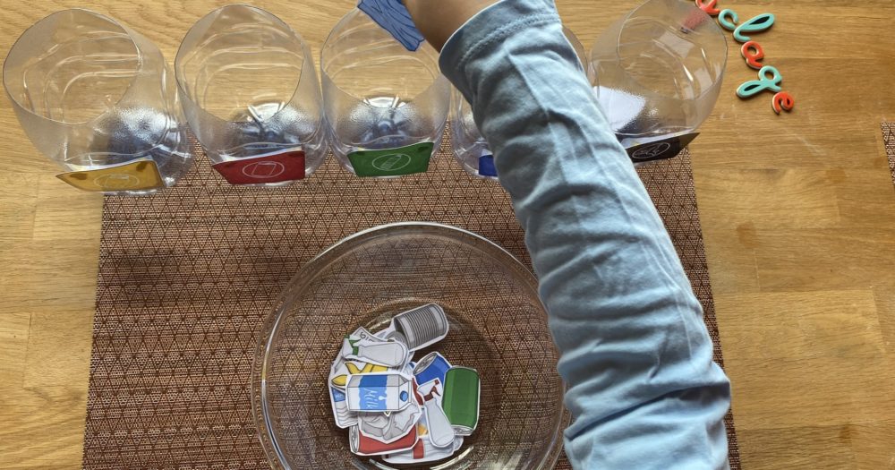 Pour réaliser l’activité j’ai coupé 5 bouteilles pour garder la partie basse pour faire des poubelles de tri. J’ai trouvé le pdf sur internet mais je n’ai pas la référence. J’ai mis dans un récipient ce que je voulais qu’elle jette et voilà.