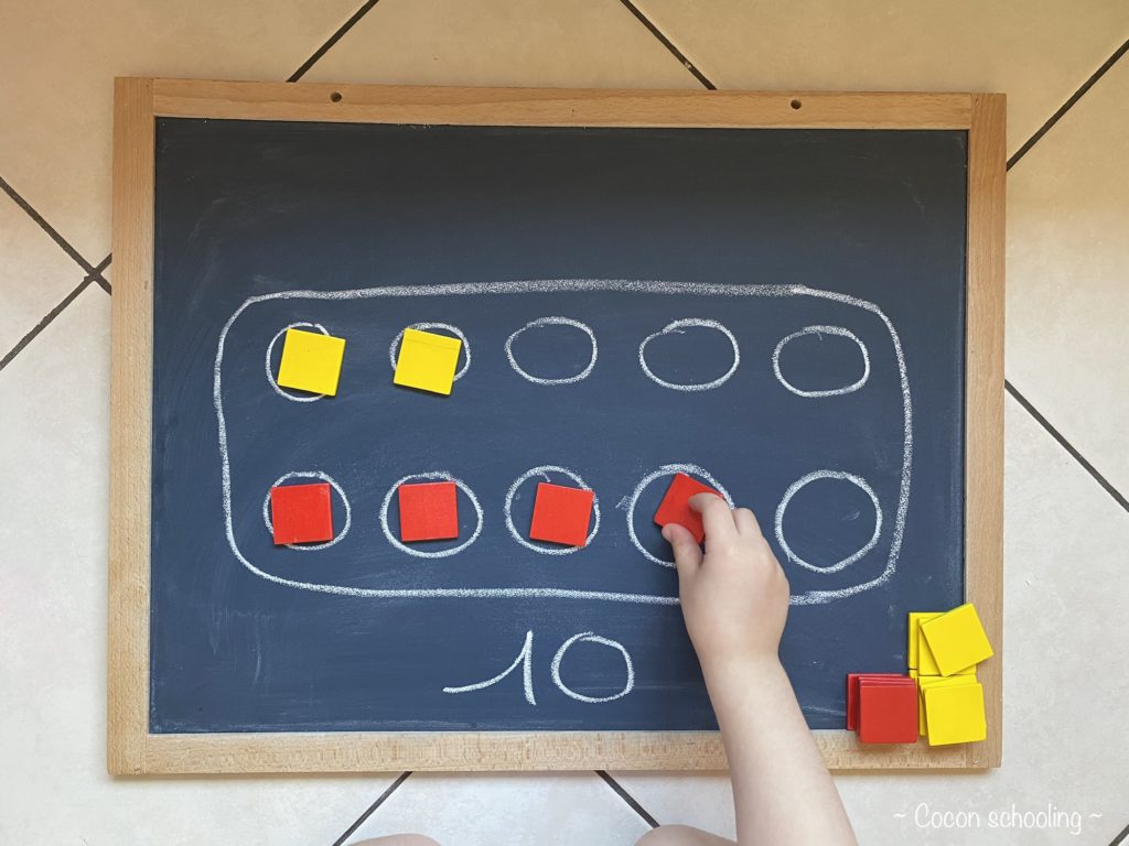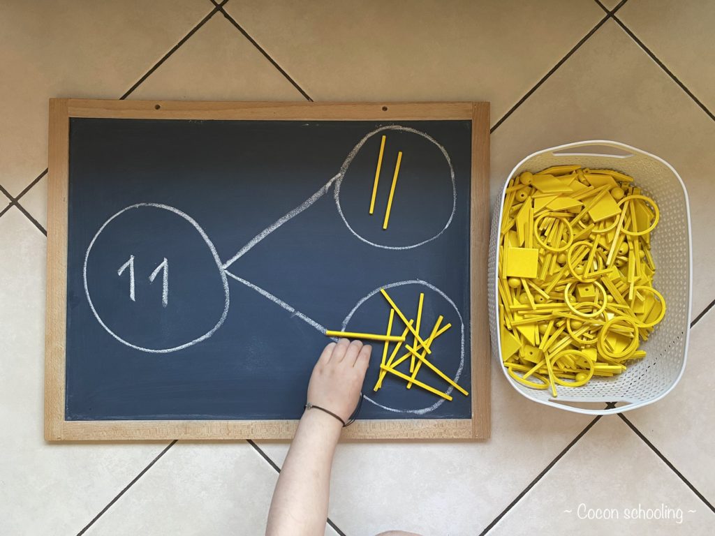 Nous avons travaillé les maths avec le matériel de l’atelier art éphémère. Entre montessori et st gapour mon coeur balance, je suis complètement fan de ce genre de méthode de calcul pour décomposer un nombre.