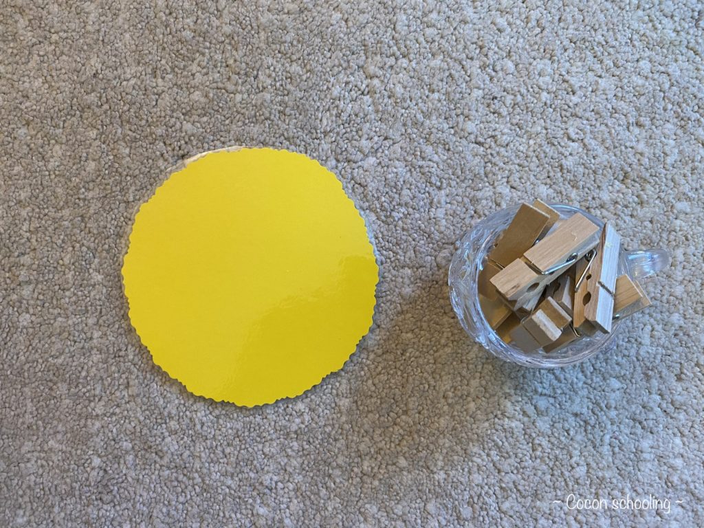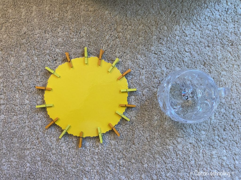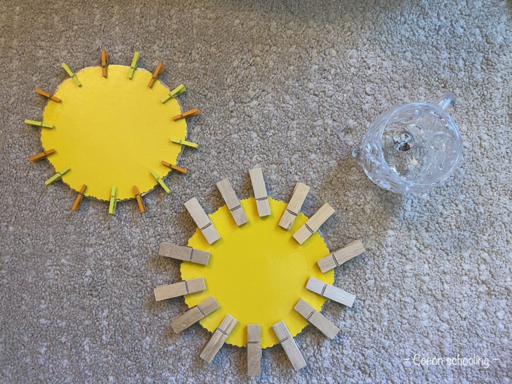 Voici les ateliers motricité pour mes deux enfants, la petite a enlevé les petites pinces colorées pour les mettre dans le verre, ma grande a mis les pinces sur le soleil. Les toutes petites pinces ne sont pas bien du tout pour travailler les doigts en les accrochants elles se décomposent, c’est pour cela que je les laisse pour ma TPS pour faire des ateliers sans trop de manipulation.