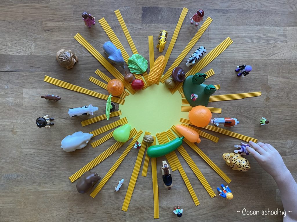 Pour ce faire vous devez faire un soleil de carton, le poser sur un tapis (moi je l’ai mis sur une table), puis faire un premier cercle de graine, fleurs, arbre ect, puis herbivore, puis carnivore, puis omnivore, et enfant ajouter quelques humains.