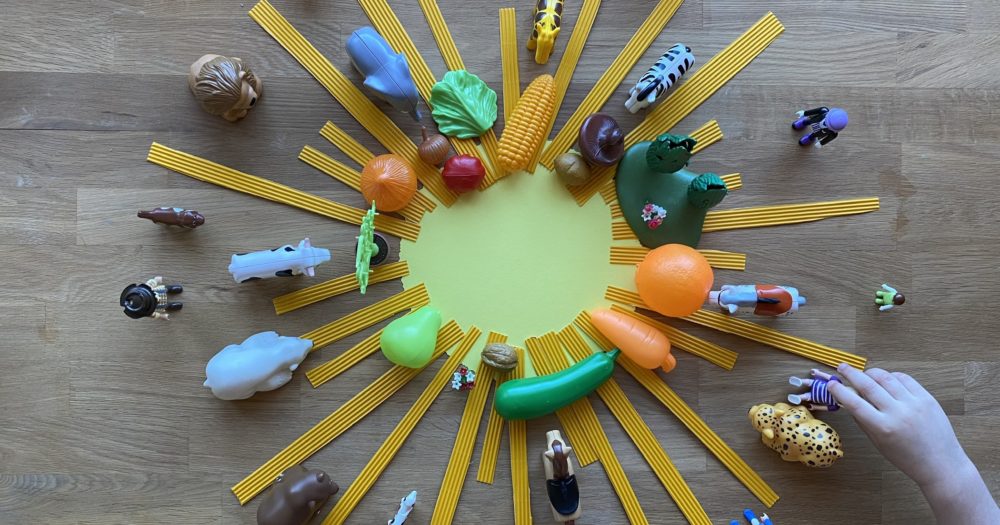 Pour ce faire vous devez faire un soleil de carton, le poser sur un tapis (moi je l’ai mis sur une table), puis faire un premier cercle de graine, fleurs, arbre ect, puis herbivore, puis carnivore, puis omnivore, et enfant ajouter quelques humains.