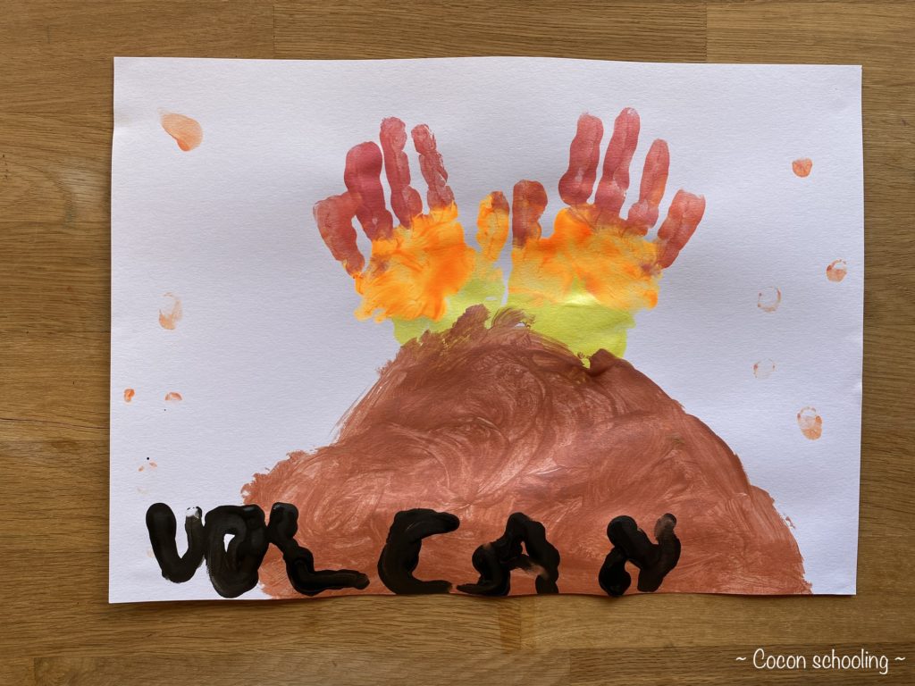 Le volcan avec les mains peintes en rouge, orange et jaune