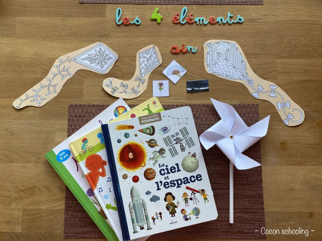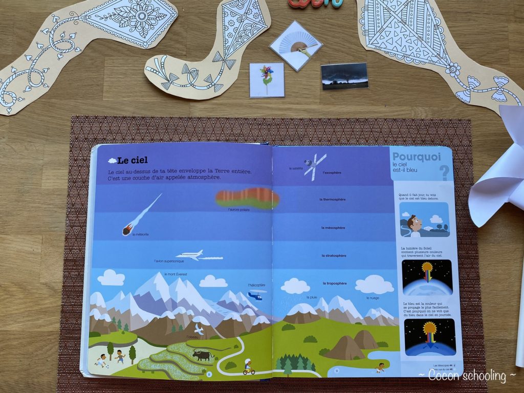 Nous avons fabriqué des petites éoliennes avec le guide du livre montessori dont je vous ai parlé plus haut. Nous avons parlé du corps humain qui a besoin d’air pour vivre, des cerf-volant qui ont besoin de vent pour voler et des éoliennes qui produisent de l’éléctricité grâce au vent.