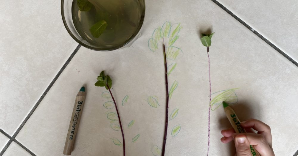 Art éphémère, j’ai préparé trois branches de menthe différente et j’ai demandé à ma fille de dessiner ce qui manquait