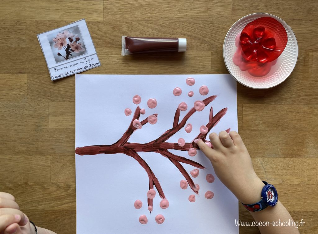 Pour l’art visuel nous avons fait une branche de cerisier du Japon, je les trouve trop belles avec leur couleur rose. Pour faire les fleurs ma grande a travaillé avec un fond de bouteille de Badoit mais je pense que le rendu peut être plus sympa si on voyait le milieu de la fleur également. Pour notre part Shérine a fait le centre avec son doigt.