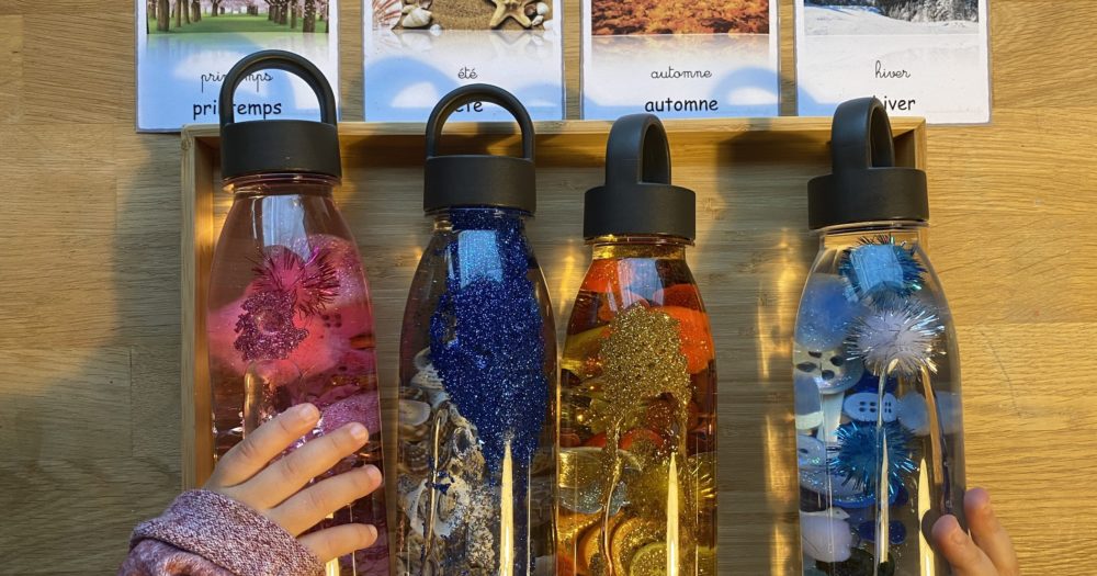 Nous avons réalisé des bouteilles de retour au calme, une bouteille pour chaque saison. Rien de plus simple, des boutons, des pompons, des paillettes et des coquillages.